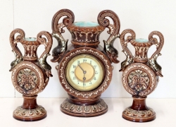 Majolikaklocka med två tillhörande vaser, litet nagg ena vasen, pendel saknas Klockhöjd 34 cm Vashöjd 28.5 cm