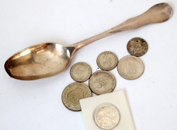 1700-tals sked, silver L: ca 21 cm Lokalmynt Huskvarna 150 kr silver 925 1 st 5 kr 1955, 2 st 2 kr 1946, 3 st 1 kr 1928/1946