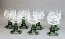 12 delar, 1900-tal, Vinglas med grön fot och kupa med etsad dekor Höjd 14 cm