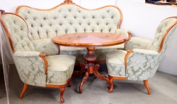 Soffa, Bord och 2 karmstolar, nyrokoko, 1900-tal, bruksslitage och fläckar förekommer. Bredd 165 cm Höjd 97 cm