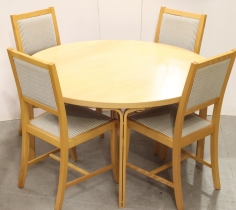 4 stolar med bord, bordet troligen DUX, 1900-tal Stolar designade av Anika Reuterswärd, bok med klädd rygg och sits Diameter 126 cm Höjd 69 cm