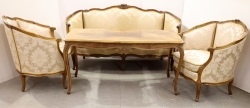Soffa, 2 fåtöljer och bord i Fransk rokoko-stil, Klädsel i blommig sation, Skuren dekor med rosor, Balj-modell Soffa bredd 155 cm
