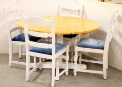 8 stolar, bord IKEA "Klacken" 1900-talets andra hälft bemålad stomme Diameter 120 cm Höjd 73 cm Iläggsskivor 2x55 cm