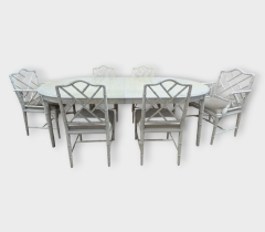 Matsalgrupp Sent 1900-tal, bord med 6 stolar varav två med armstöd, 2 iläggskivor Bordsmått H73 cm D 120 cm Iläggskivor 50 cm