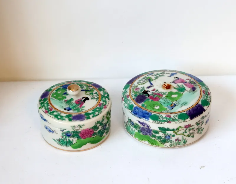 Ett serveringsfat och två lockburkar, ena lockburken är knoppen av men den medföljer
