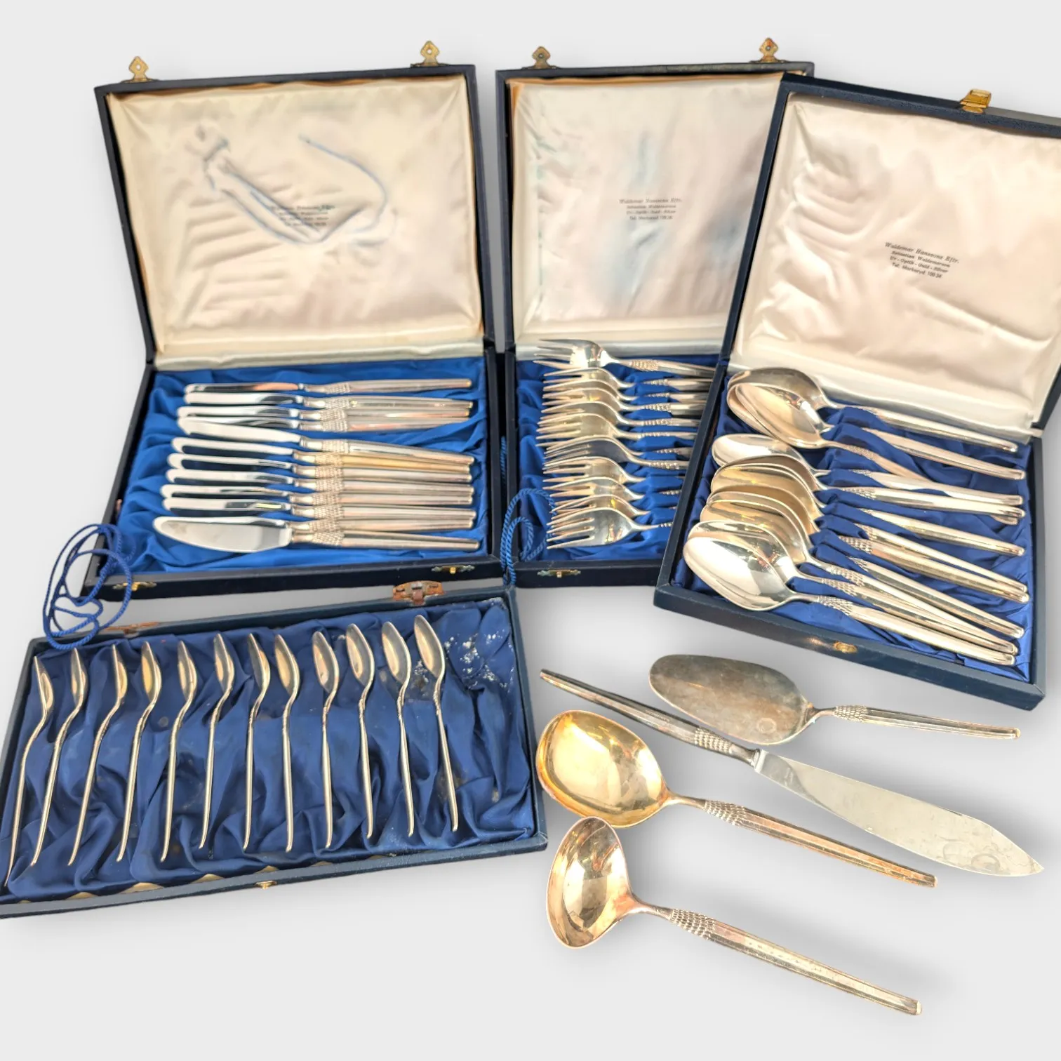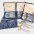 12 knivar, 12 gafflar, 12 skedar, 12 kaffeskedar, tårtspade, såsslev, stor sked, pajkniv