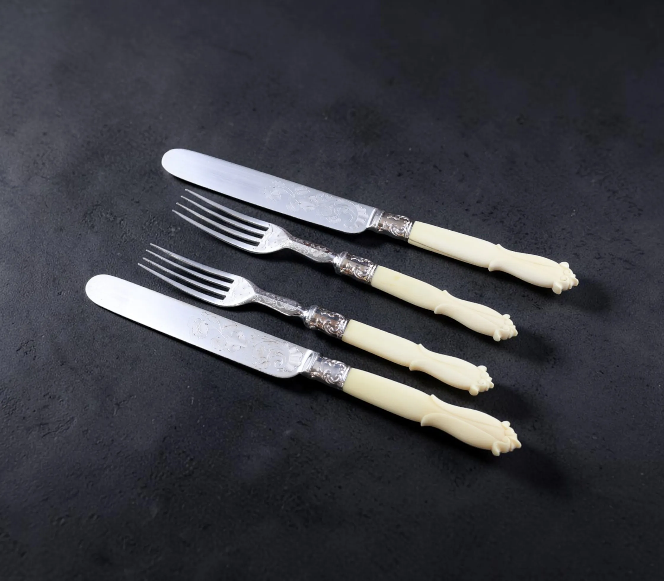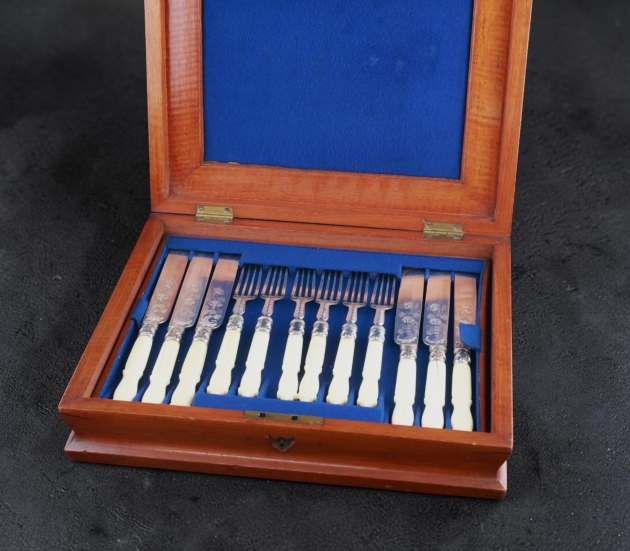 Bestickset i schatull, pläter med benimiterat skaft, England, Stämplat A H J H