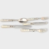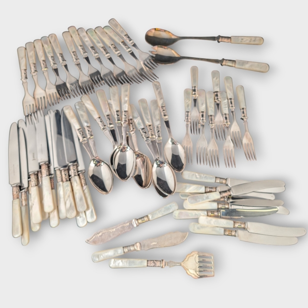 12 gafflar, 12 knivar, 12 skedar, 8 dessertgafflar, 8 dessertknivar, 2 salladsbestick, 2 smörknivar, 1 dessertspade