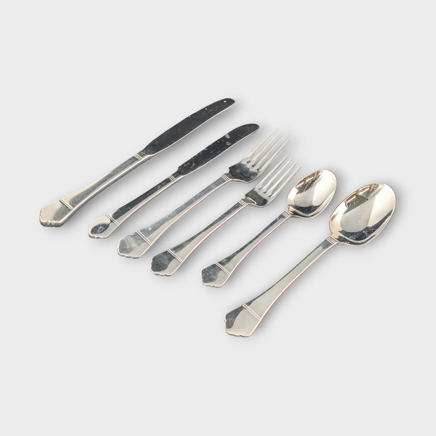 12 knivar, 12 gafflar, 12 skedar, 10 dessertknivar, 10 dessertgafflar, 9 dessertskedar