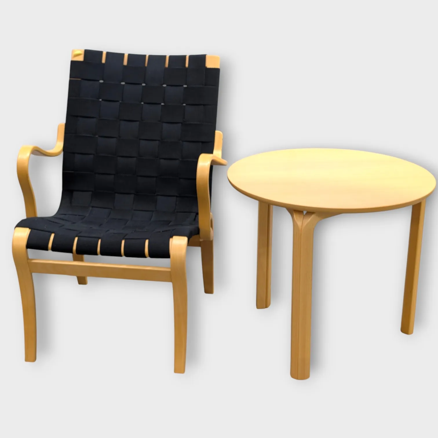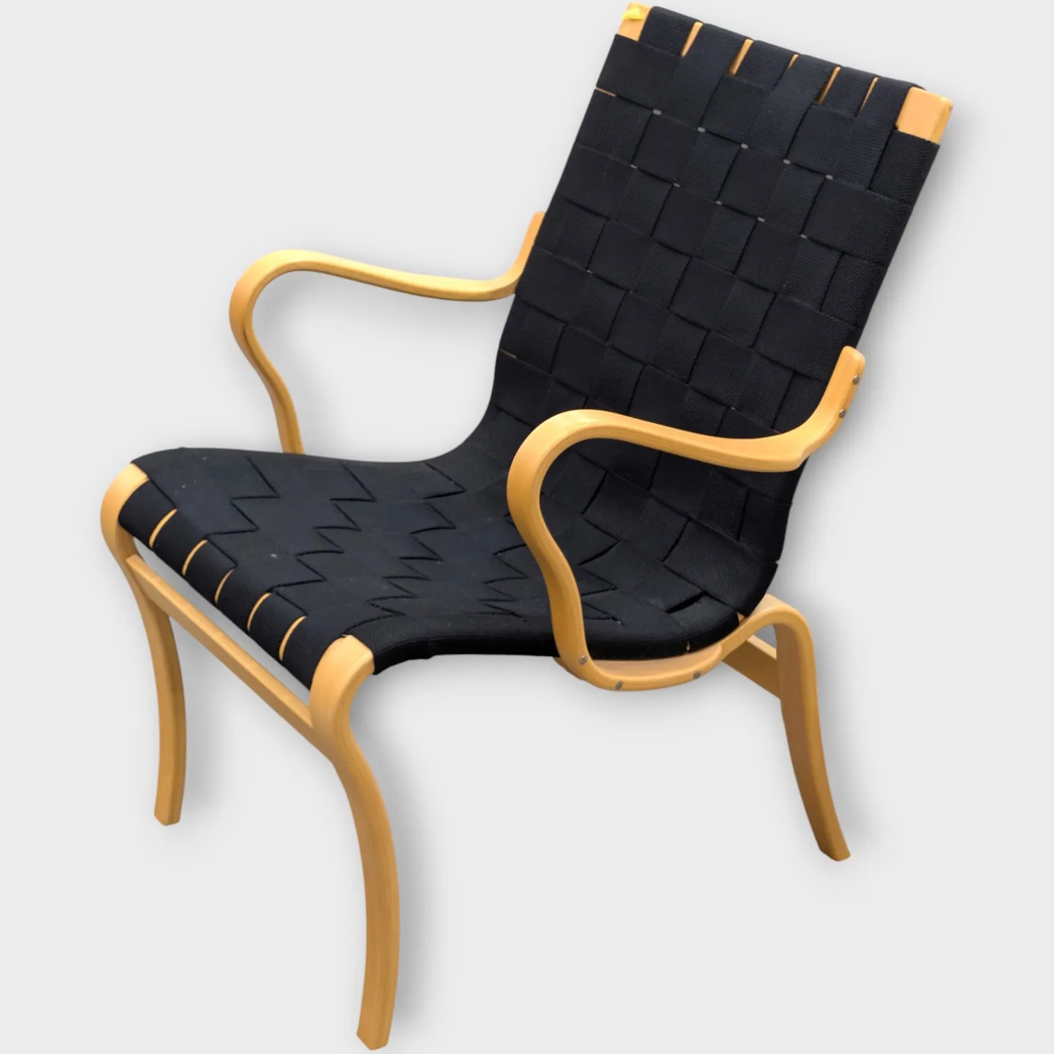 Fåtölj. "Mina". Brännmärkt BRUNO MATHSSON DESIGN, Stomme i skiktlimmad bok och björk. Klädsel i flätad sadelgjord.