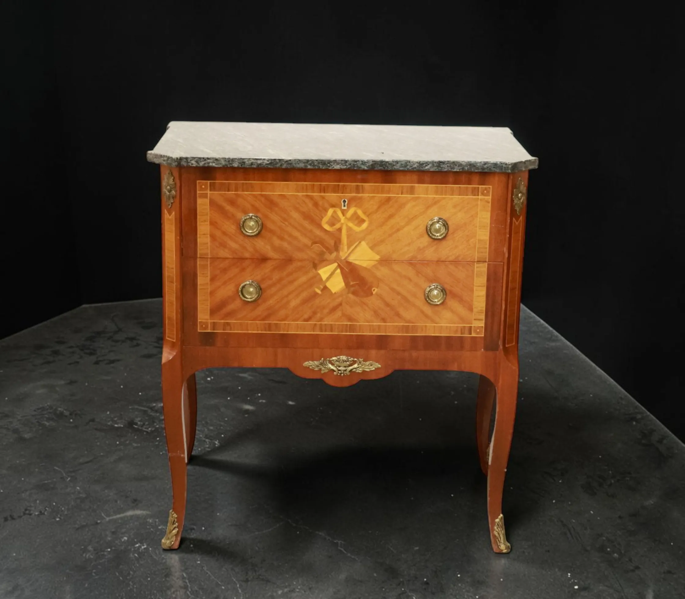 Byrå med intarsia, mässingsbeslag, stenskiva och två lådor