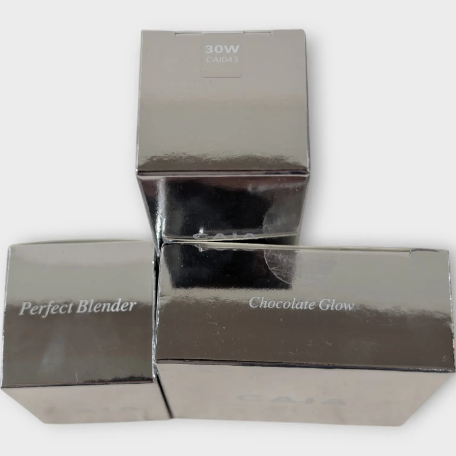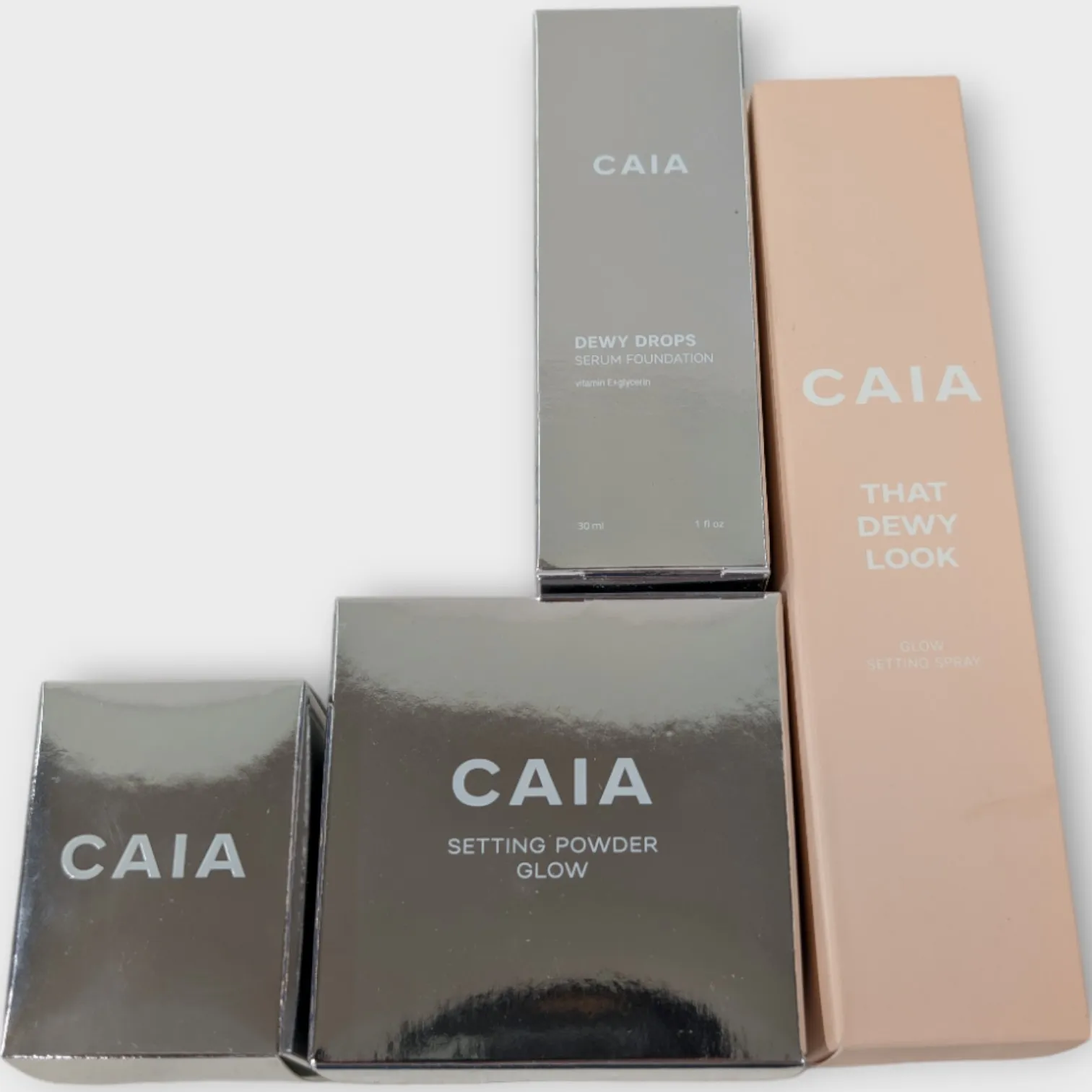 Caia Glow Settingspray, Caia serum foundation, Caia Setting Powder och Caia Perfect blender