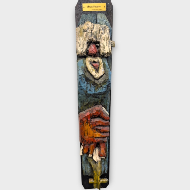 Träfigur skulpterad av Calle Örnemark, "Brasklappen", Signerad