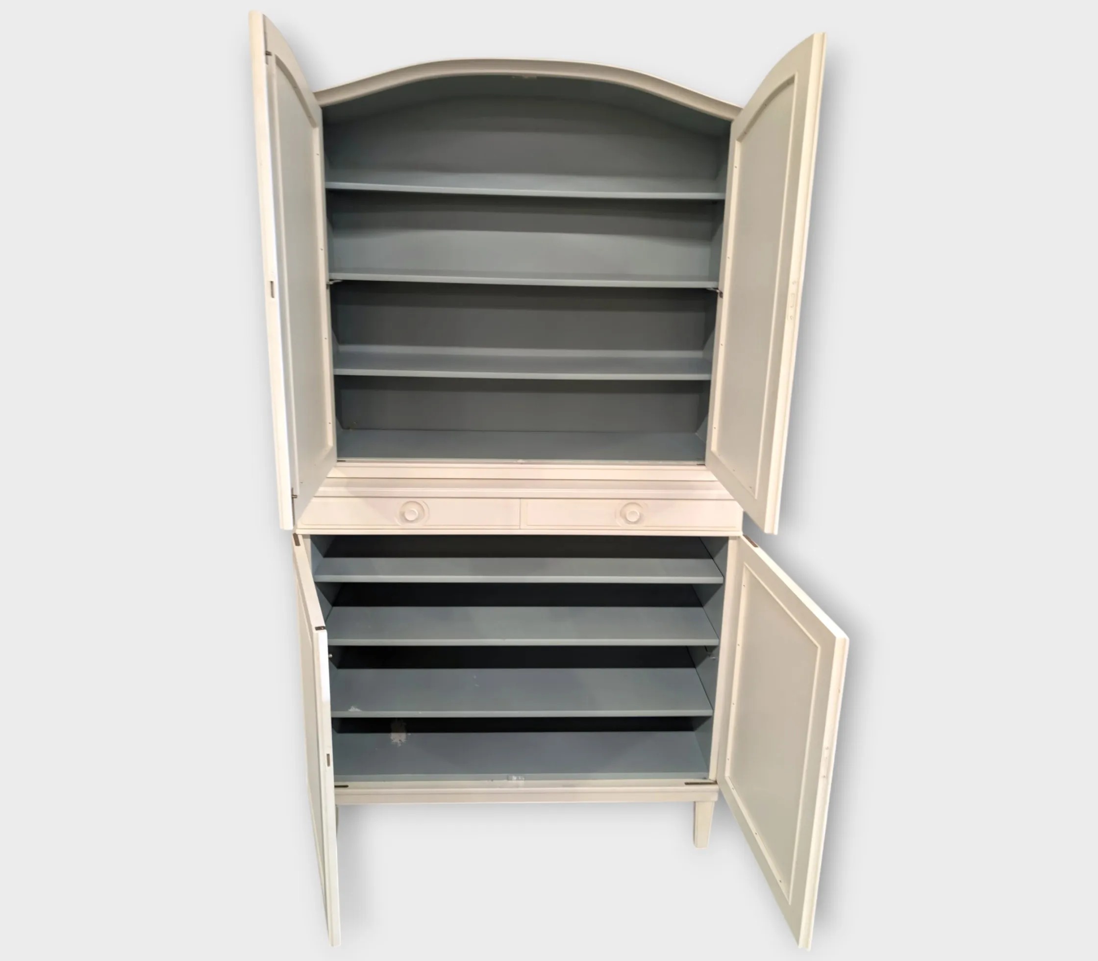 Tvådelat skåp med två par dörrar och två lådor. Flyttbara hyllor. Brännmärkt.
