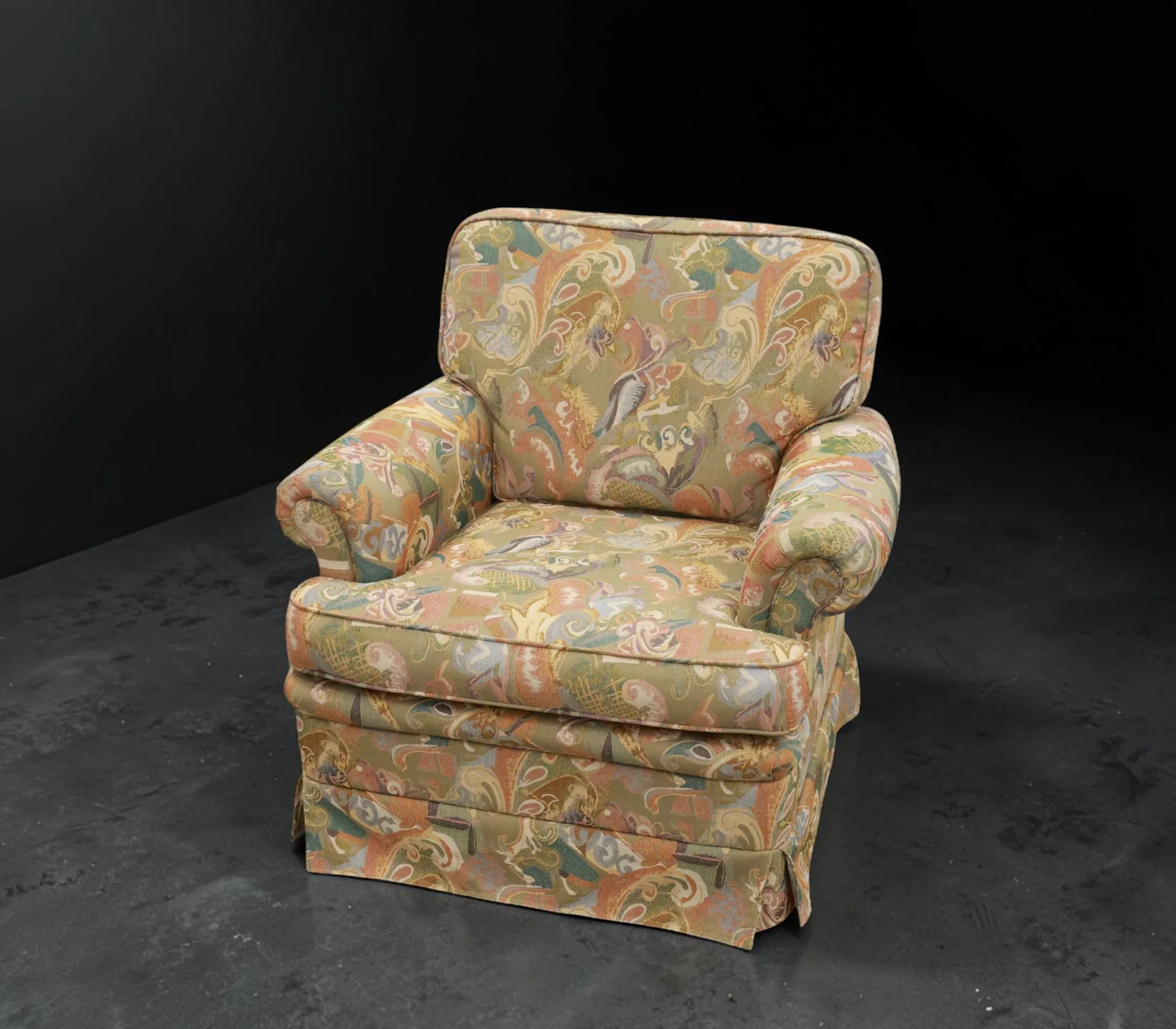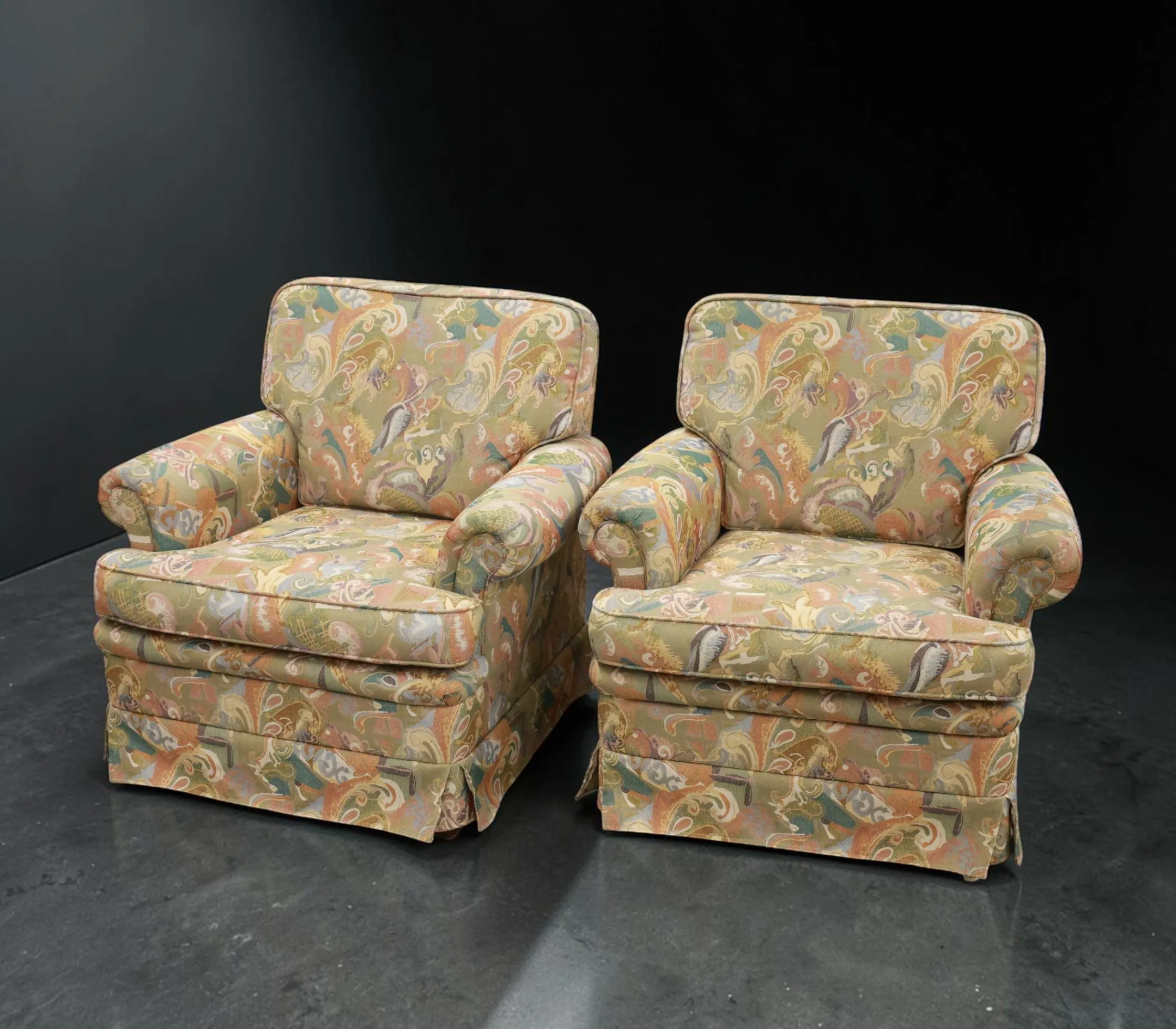 Ett par fåtöljer med mönstrat tyg,1900-talets andra hälft, bruksslitage
