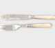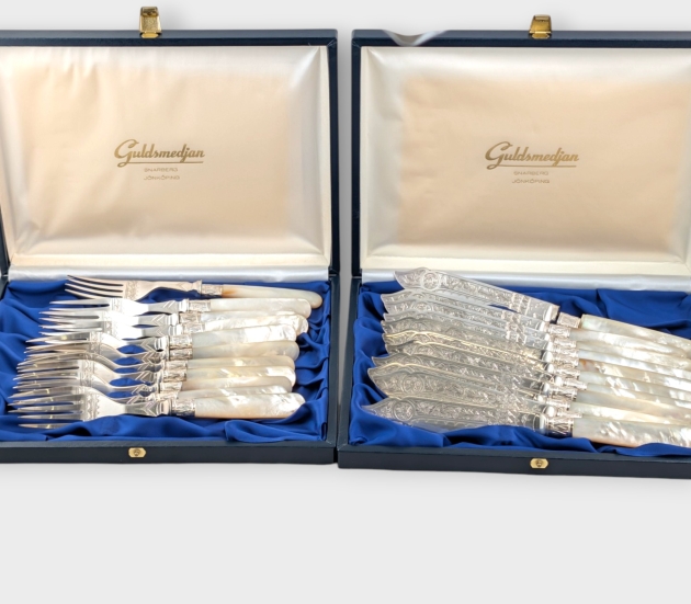 11 st Gafflar och 11 st knivar med graverat blad och pärlemorskaft