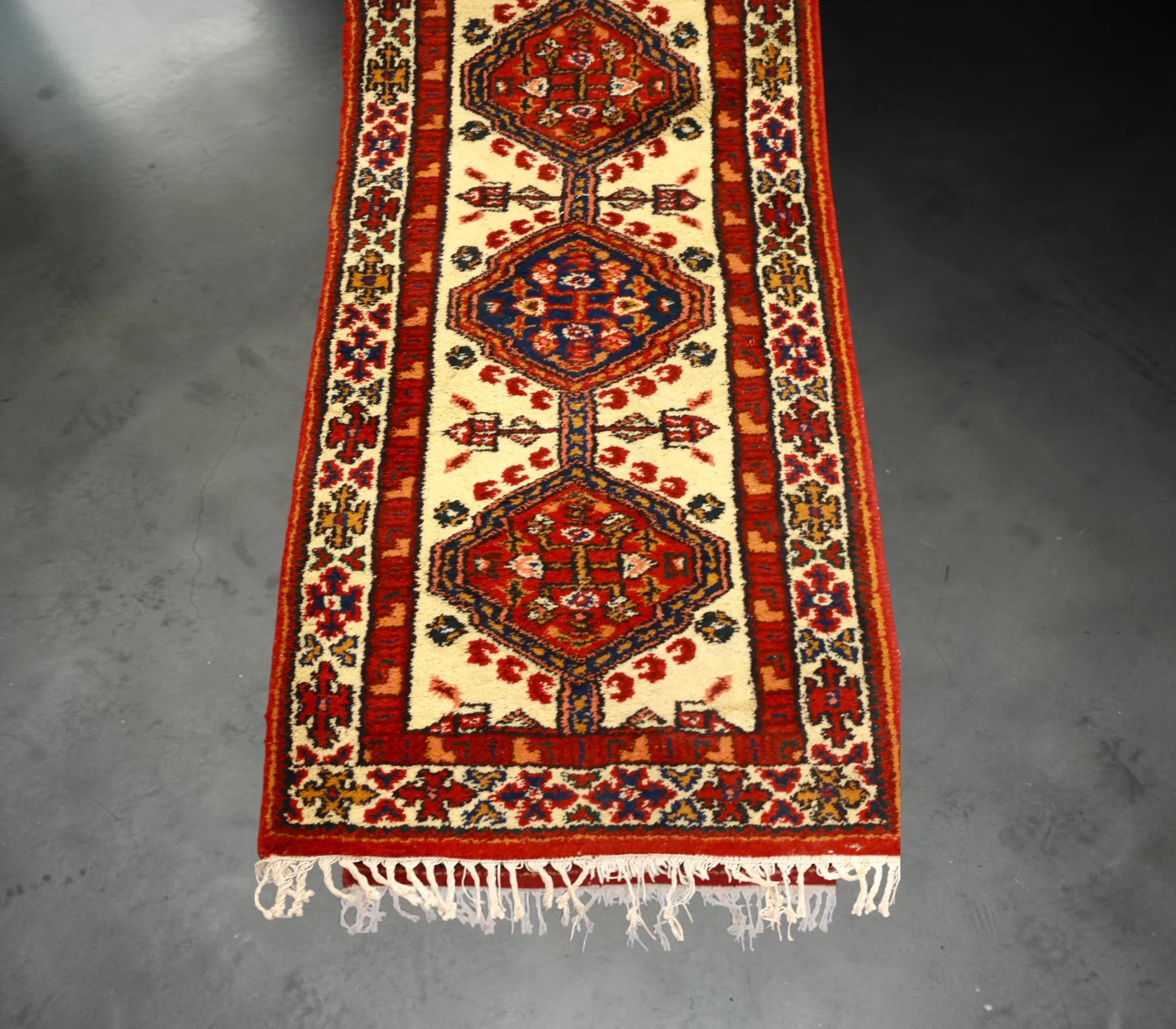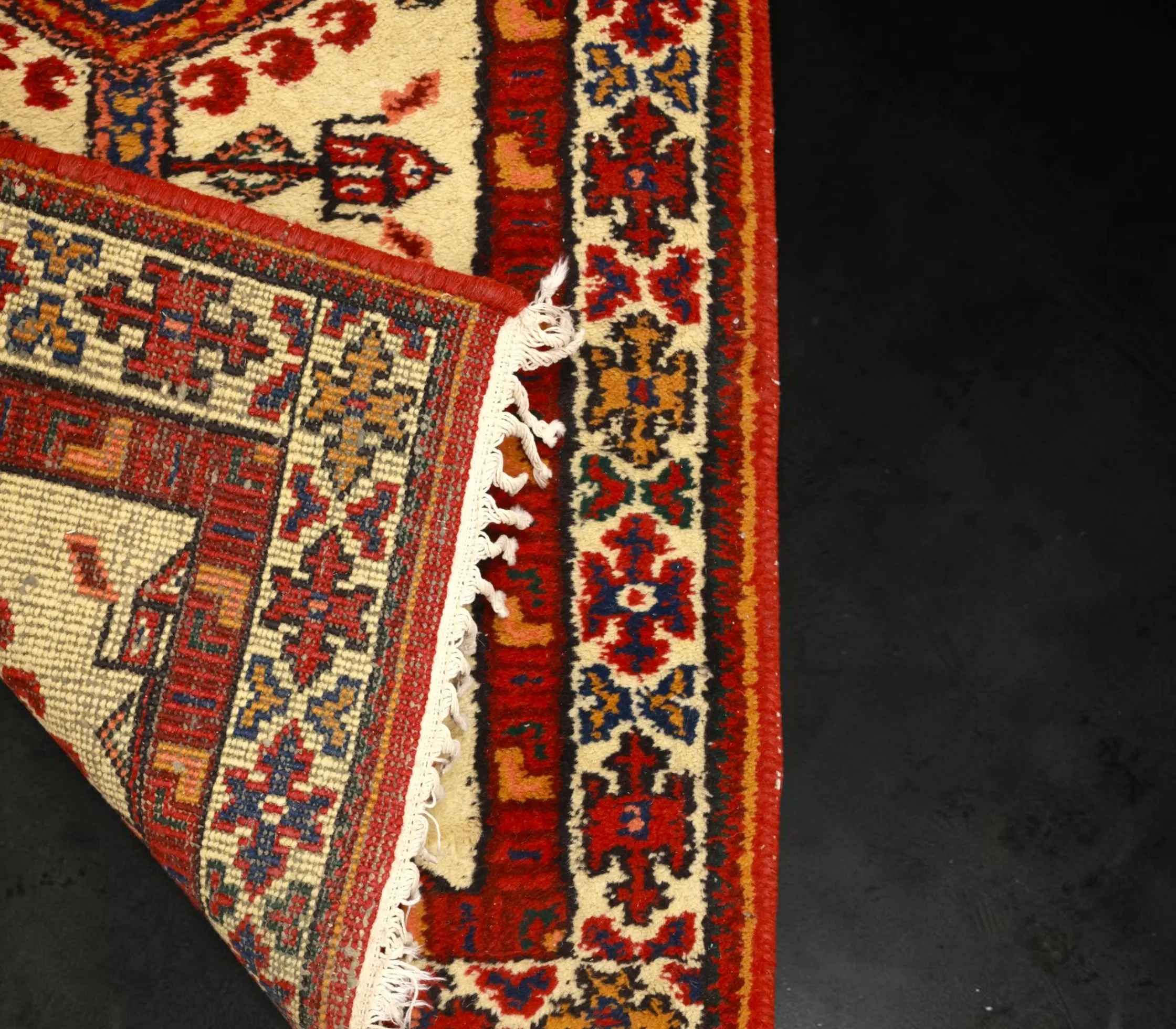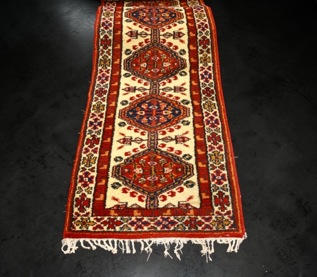Handknuten gallerimatta, slitna fransar