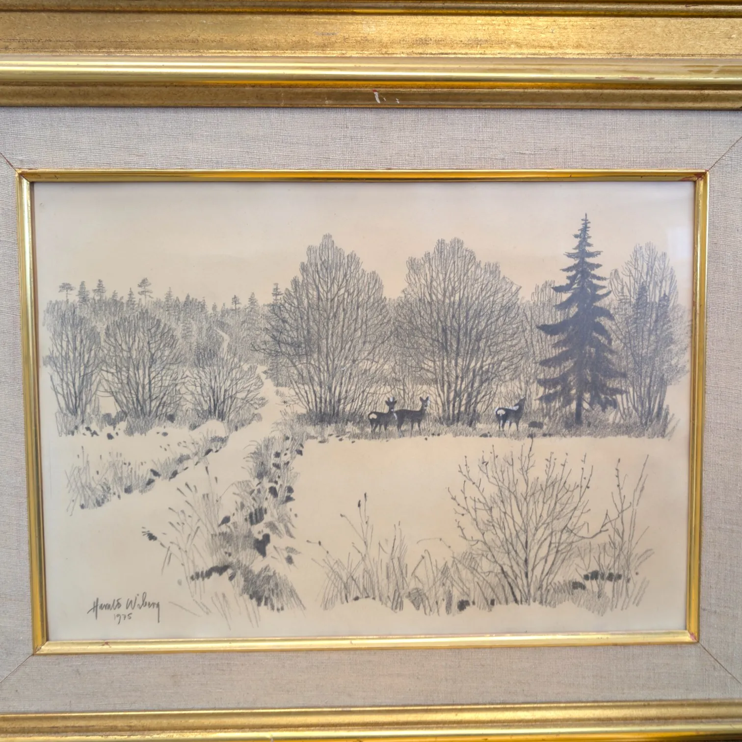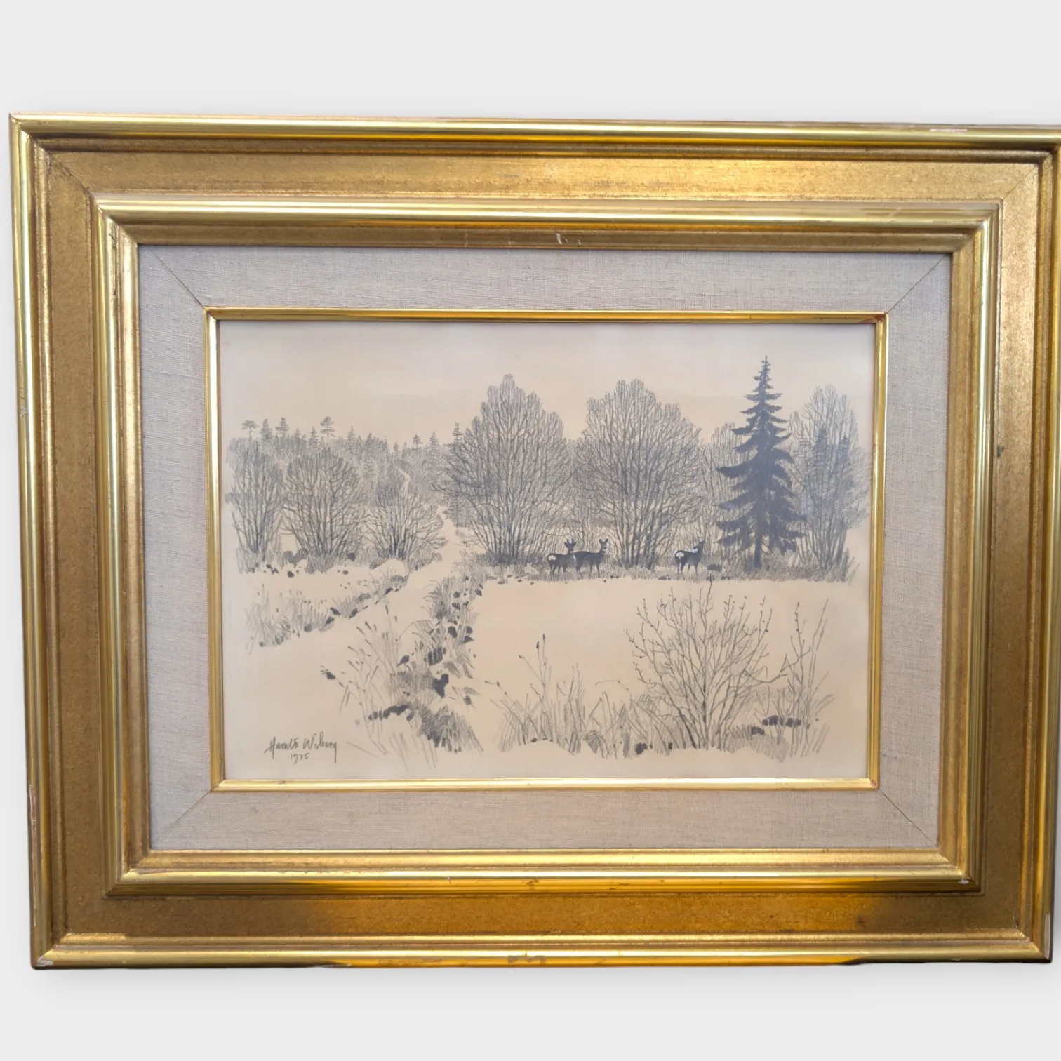 Blyertsteckning, vinterlandskap med rådjur, signerad och daterad 1975