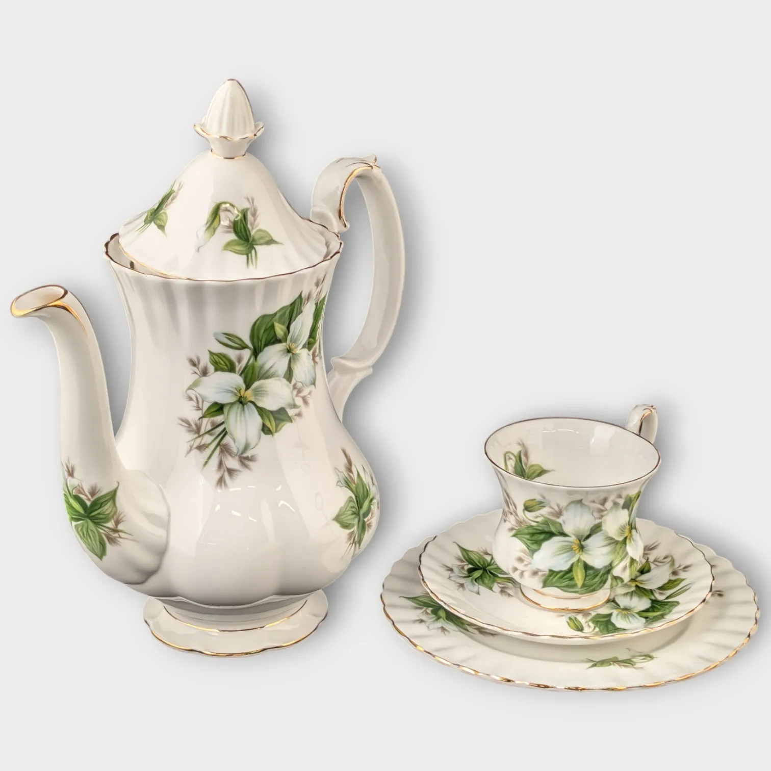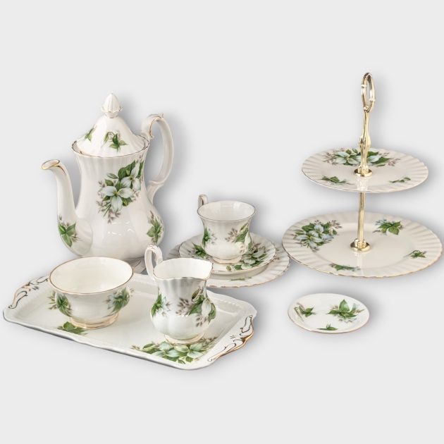 12 Kaffekoppar med fat 12 assietter, uppläggningsfat, gräddsnipa och kanna