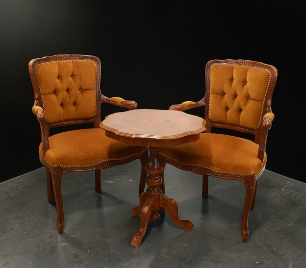 Ett par karmstolar med bord, 1900-tal, klädd sits och rygg