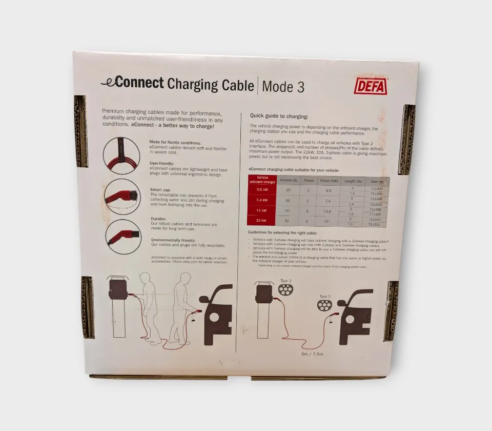 Laddkabel eConnect 13,8 kW Typ2 till Typ2, 20A, 5m DEFA, med Defa econnect docking