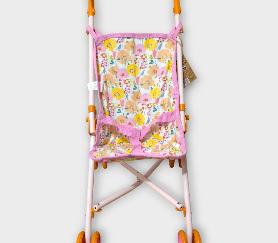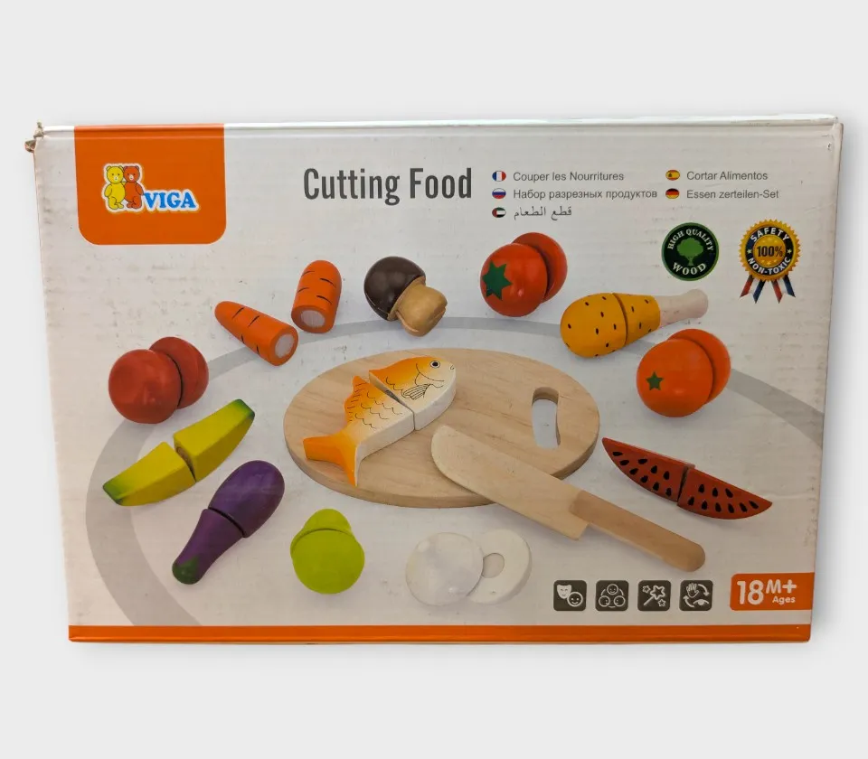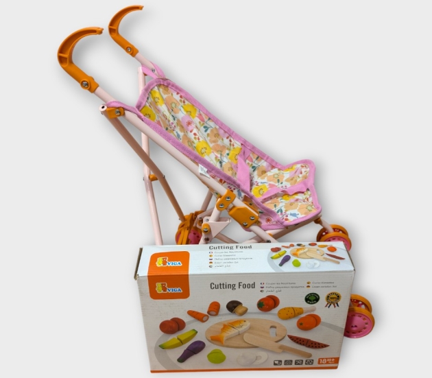 Barnvagn och Skärbräda med kniv i trä med träfrukter och grönsaker