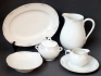 12 mattallrikar, 12 djupa tallrikar, 6 efterrättstallrikar, 6 assietter, 7 uppläggningsfat, kanna, sockerskål, gräddsnipa,