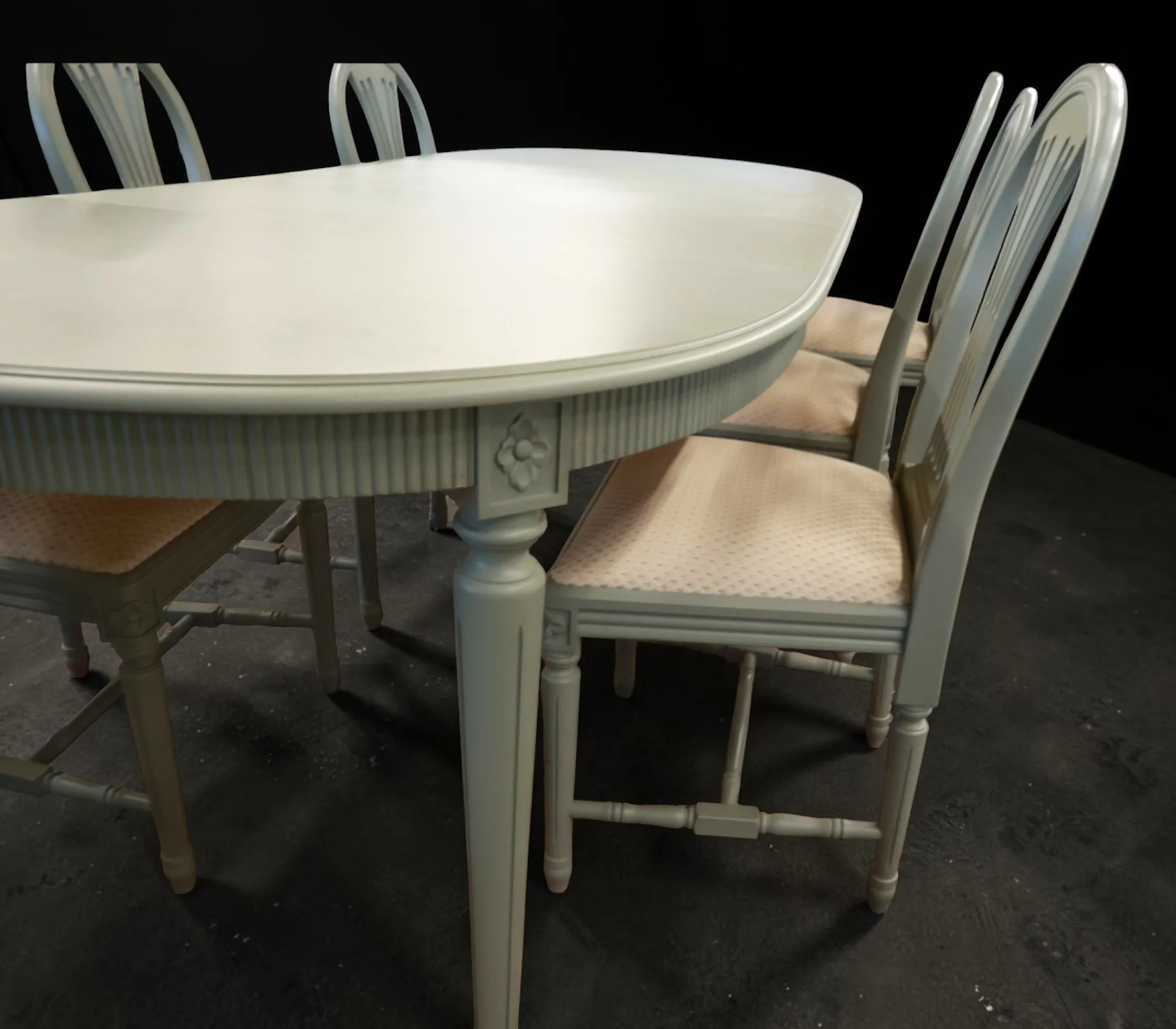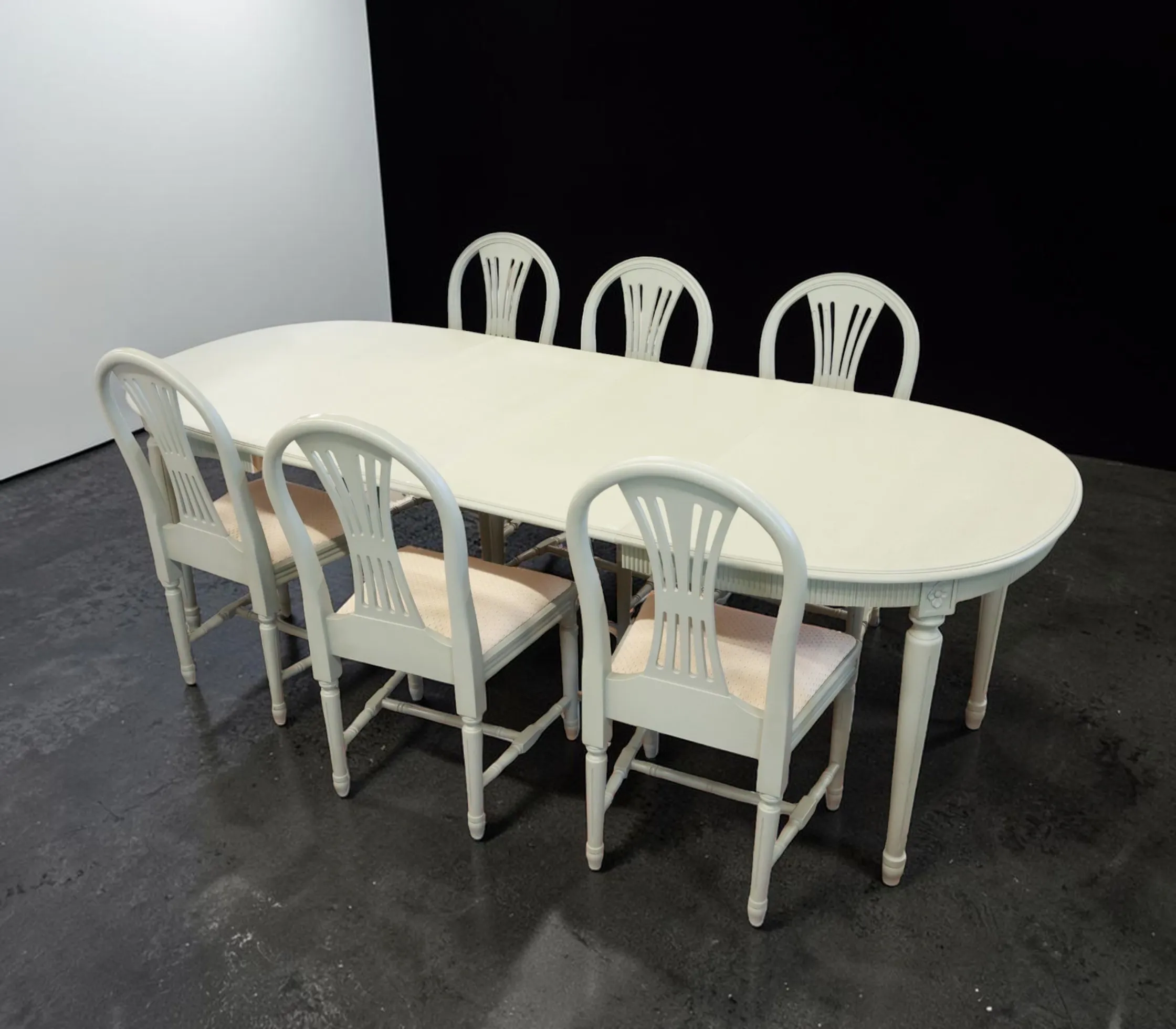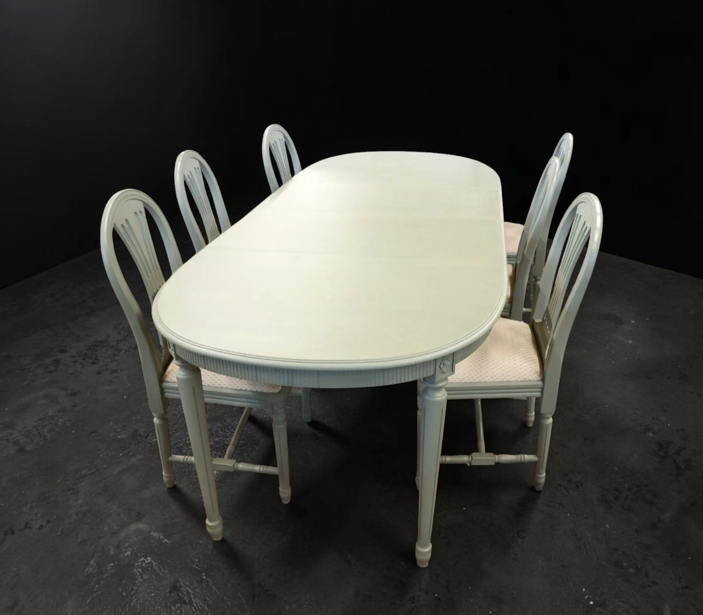 Gustaviansk stil, 1900-talets andra hälft, 6 stolar och bord, 2 iläggsskivor