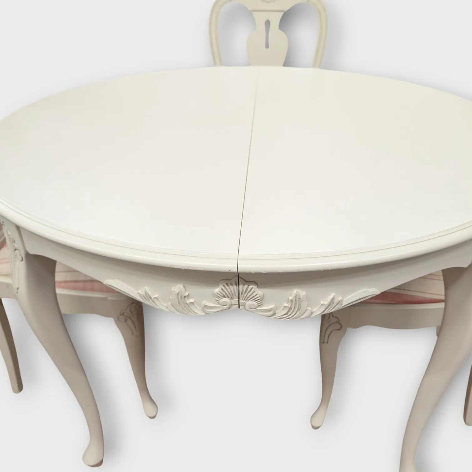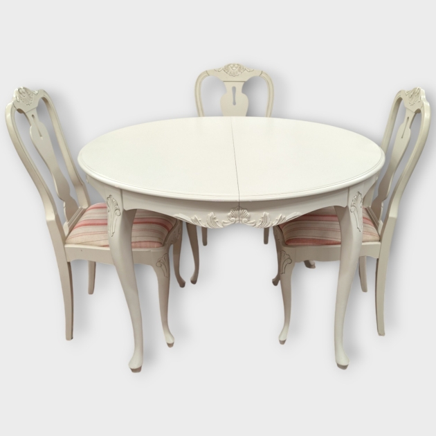 Bord och 4 stolar, 1 iläggsskiva (repad och fläck),