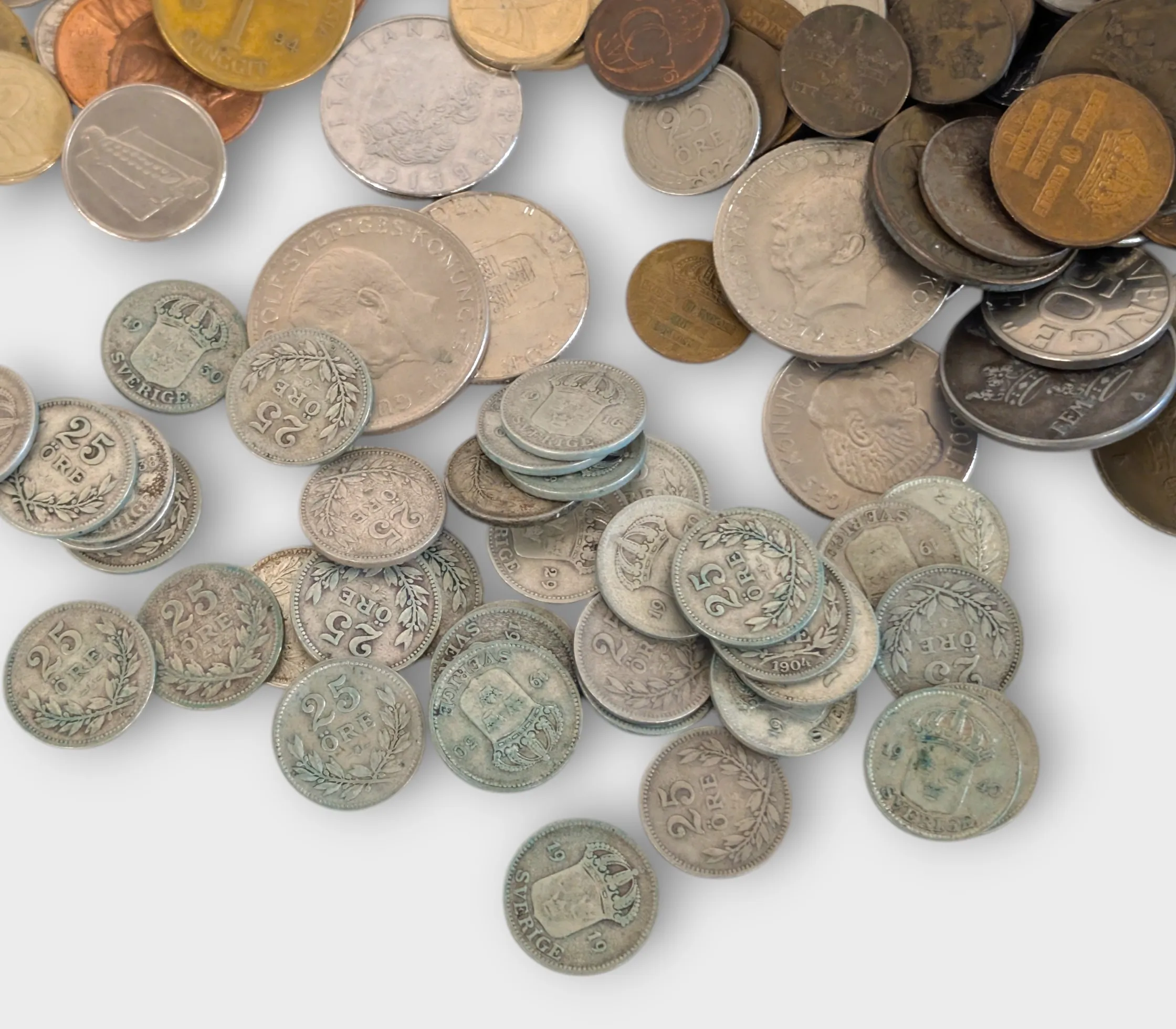 38 st 25 öringar, blandande mynt silver och annat mestadels svenskt