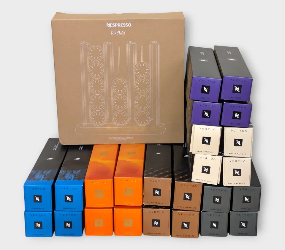 24 paket med kapslar, 6 olika smaker och en kapselhållare från nespresso
