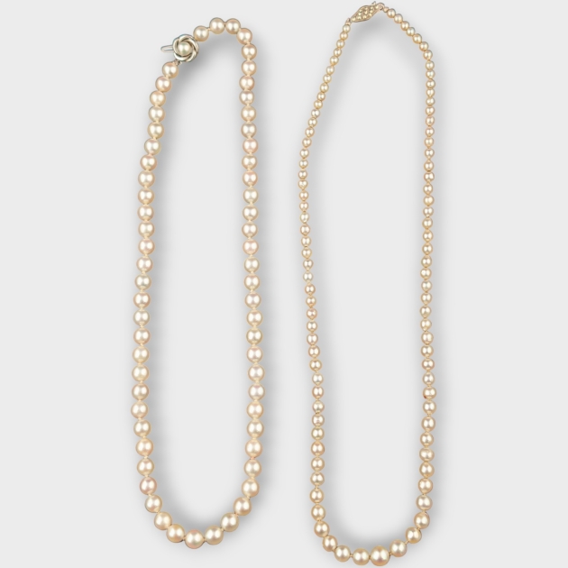 2 pärlshalsband med silverlås, saltvattenspärlor