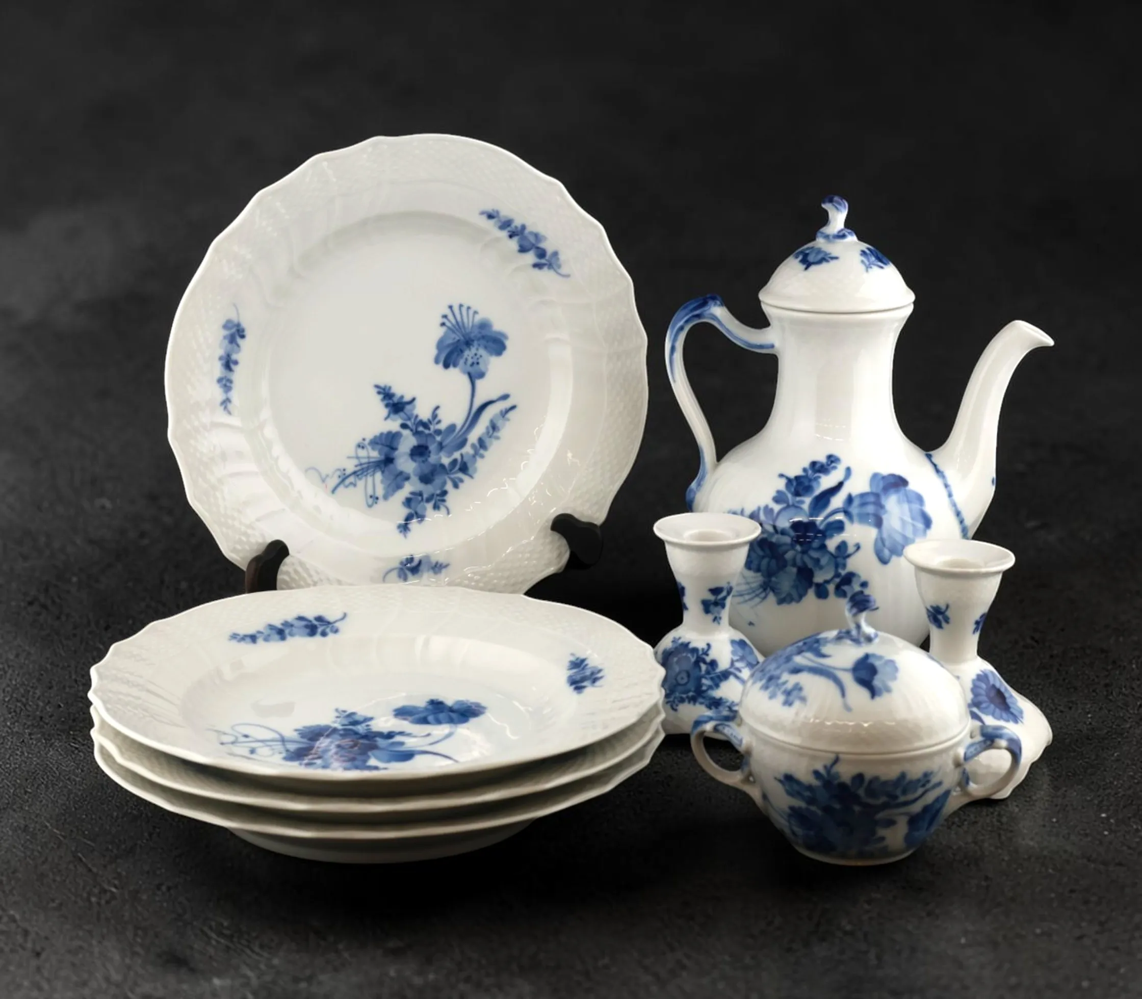 4 mattallrikar 10/1621, ett par ljusstakar 10/1711, sockerskål 10/1680 och kanna 10/1794, Salt och pepparkar 10/1876 10/1706