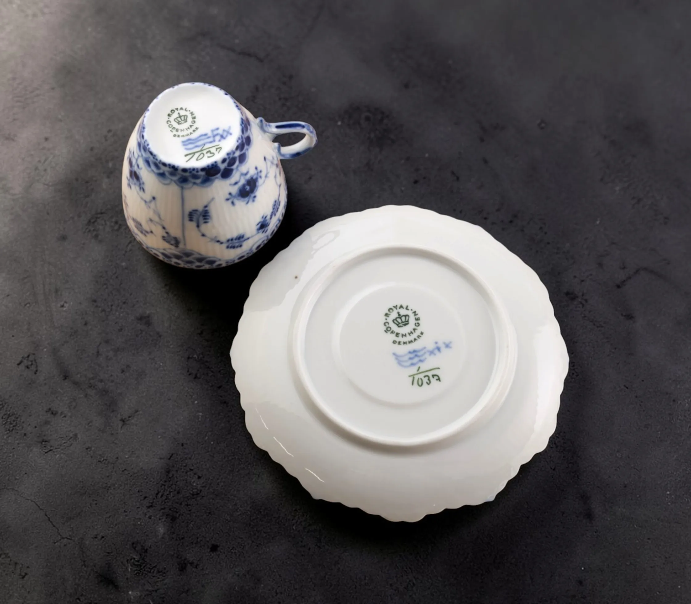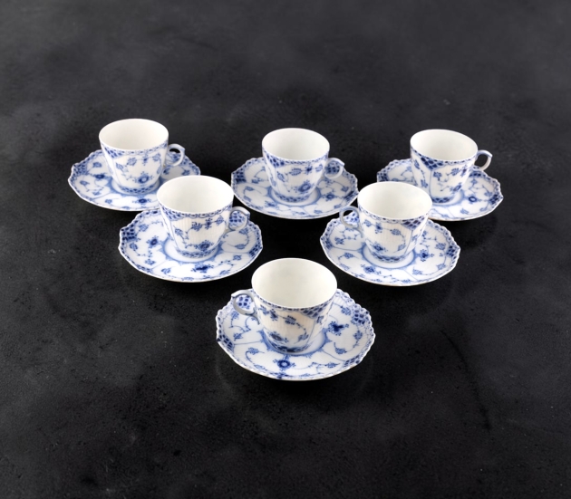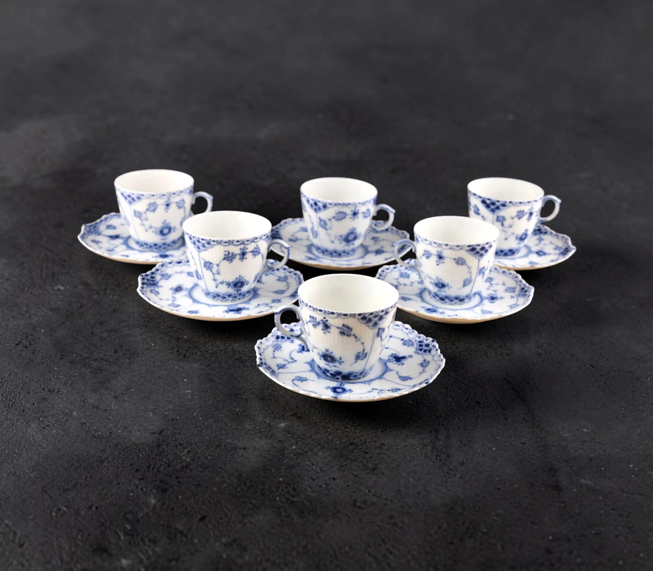 Royal Copenhagen "Musselmalet", 6 koppar med fat, 1a sortering
