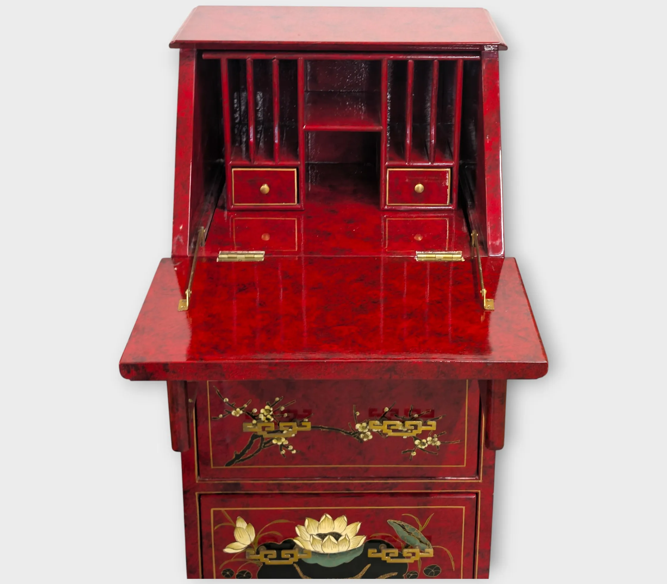 Lack, Kina, 1900-talets sista kvartal, 4 lådor, fällklaff med skrivinredning och dekor av blommor