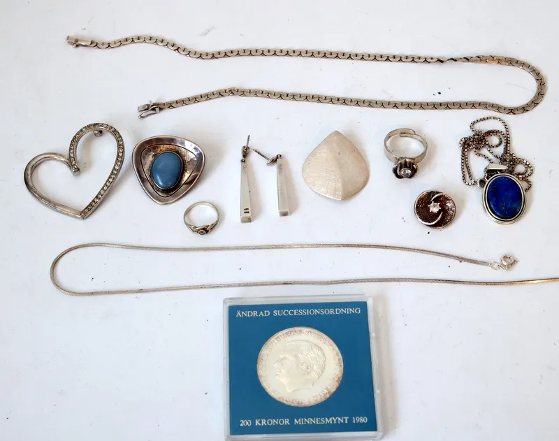 Bland annat hängsmycke av Theresia Hvorslev, Alton ring, 200kr minnesmynt med mera