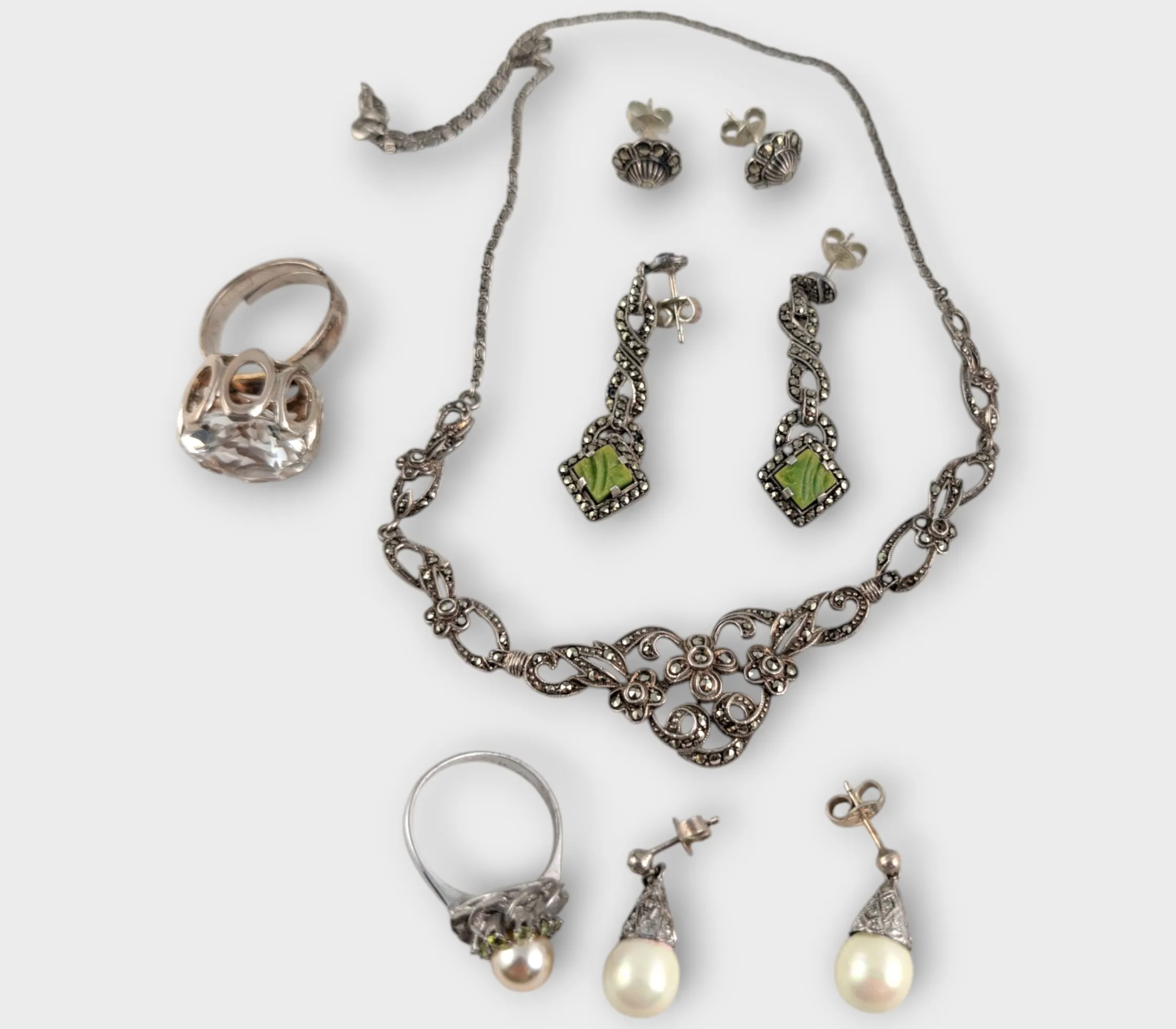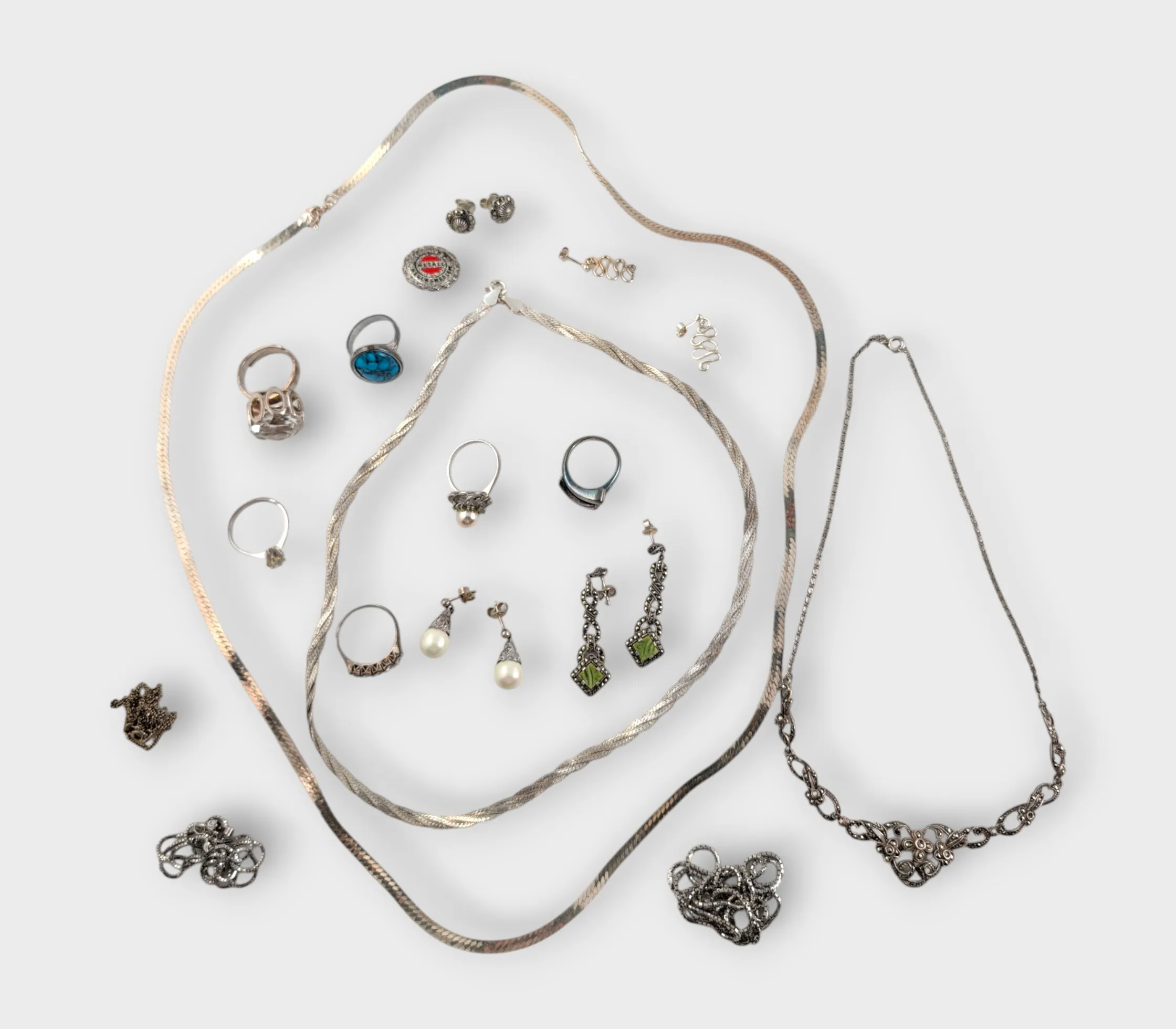 Silversmycken i olika utföranden, halsband, armband, ringar, med mera