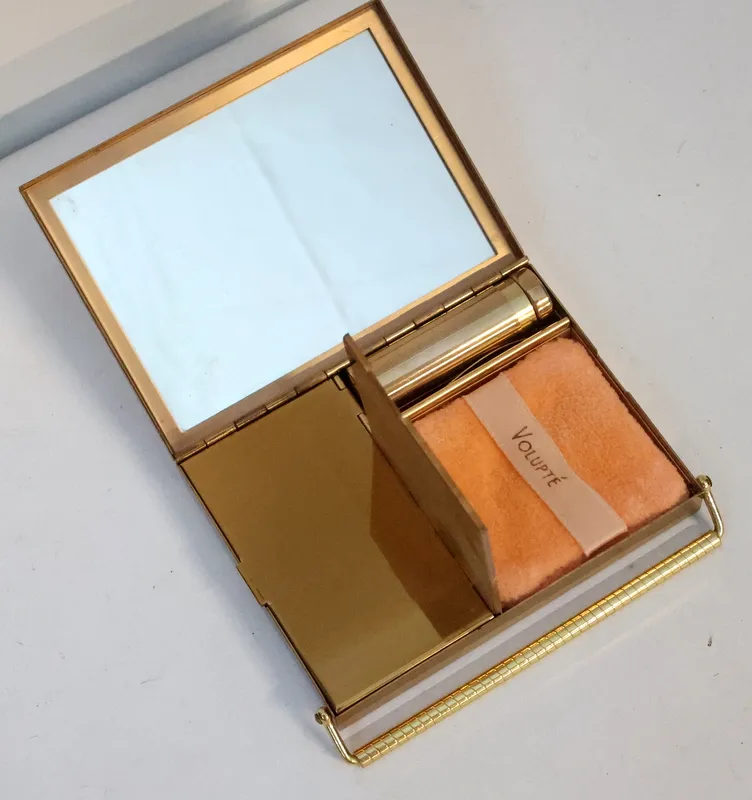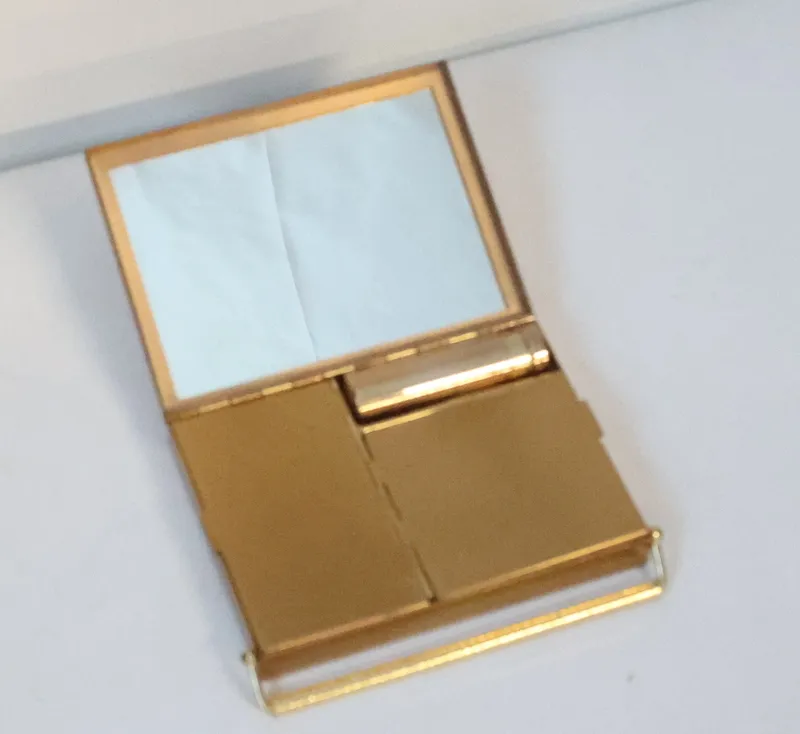 Sminkväska i mässing med spegel, läppstiftsbehållare och fack,