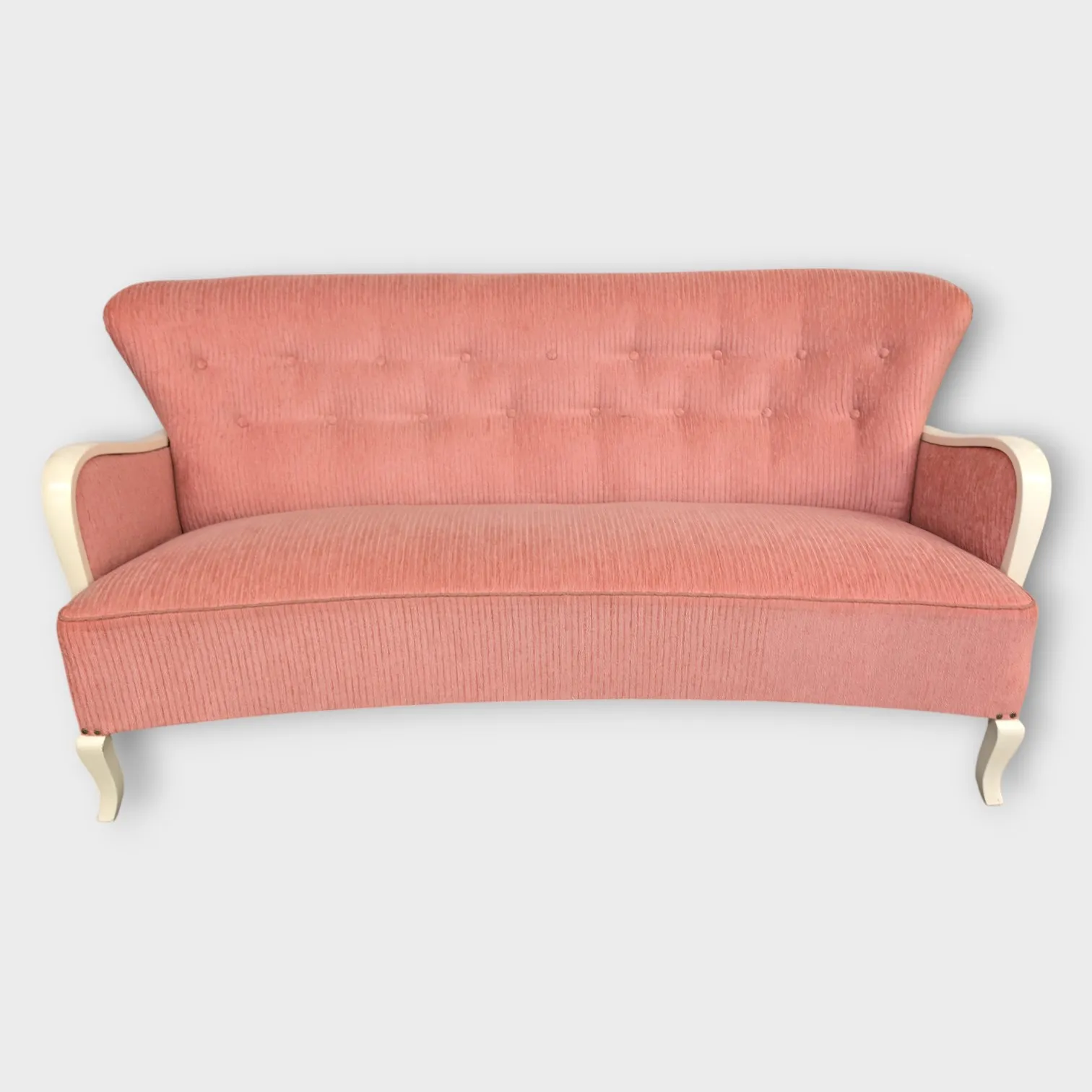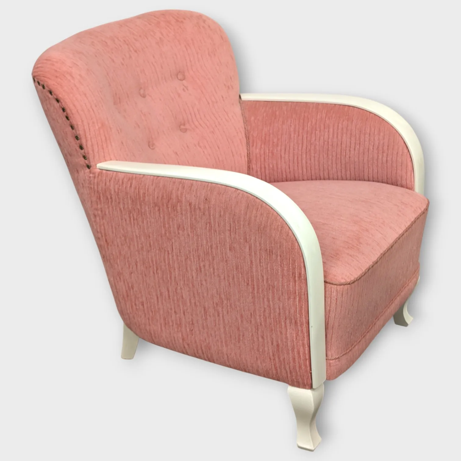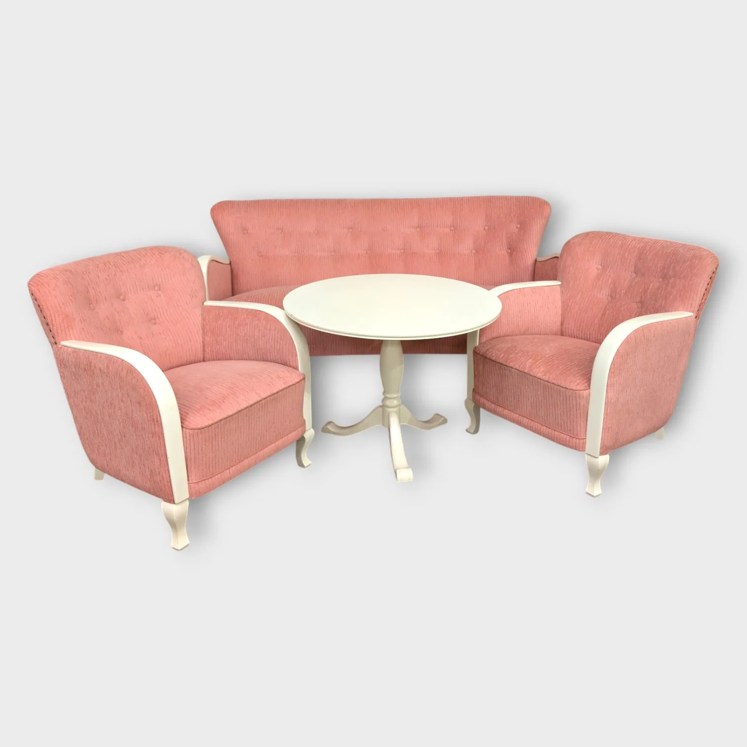Soffa, bord och 2 fåtöljer, Art deco-stil, rosa klädsel med vitmålade ben