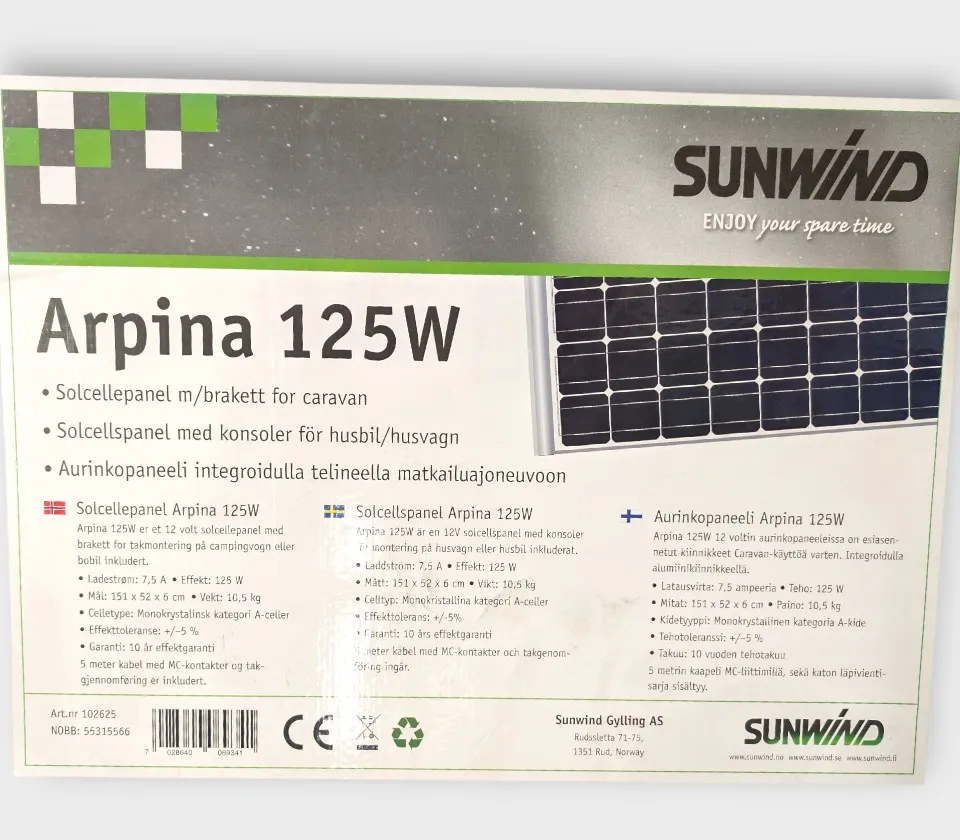 Solpanel för montering på husbil eller husvagn.Integrerade monteringsprofiler samt kabel och takgenomföring.