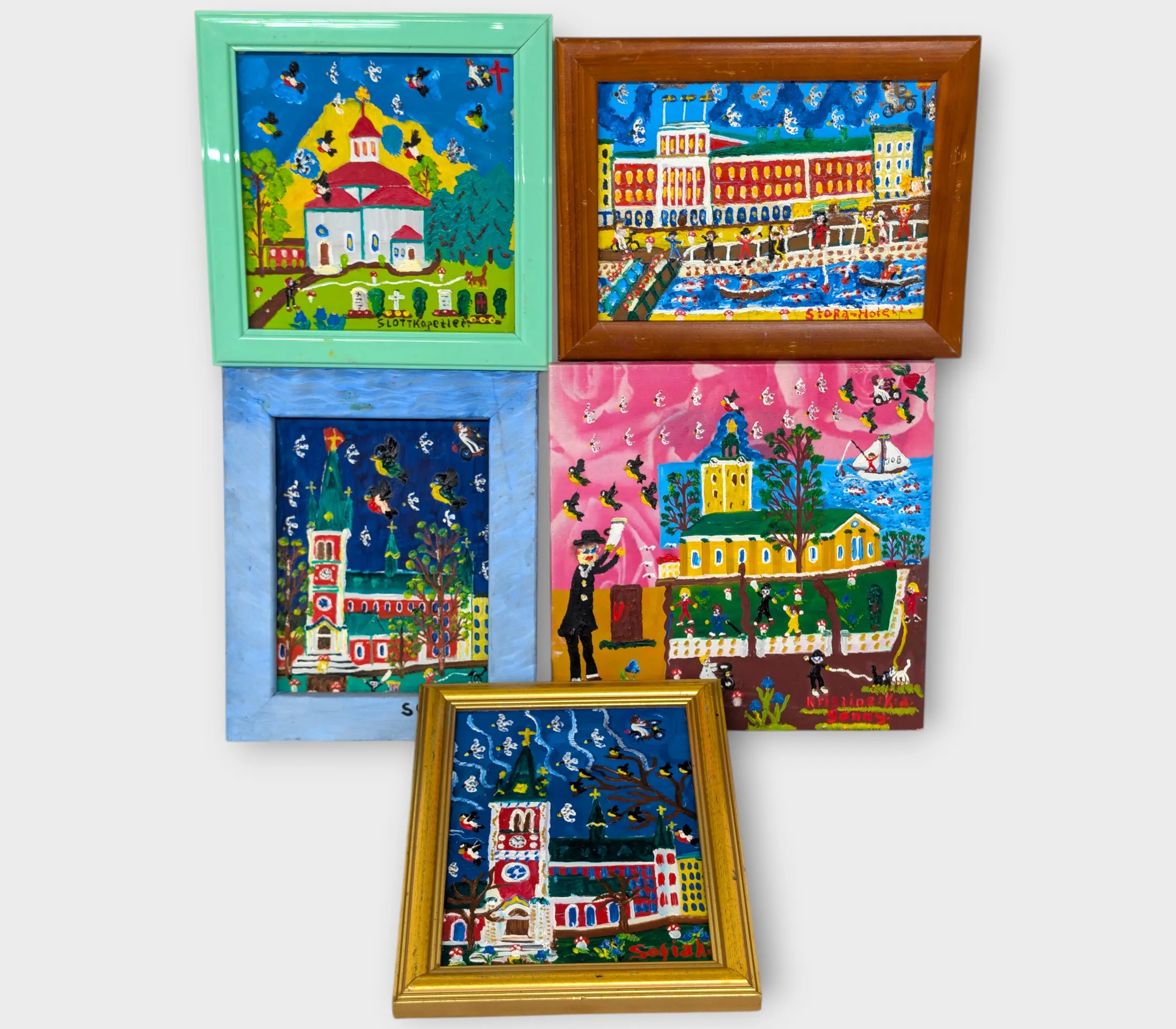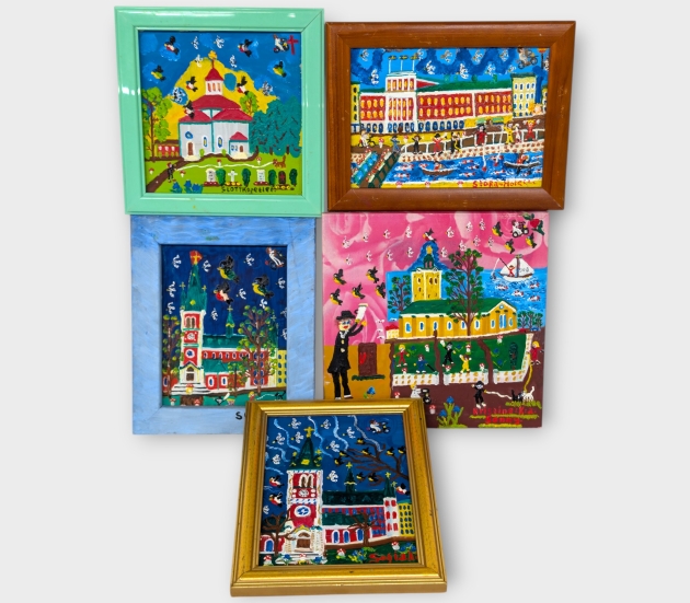 5 st mindre tavlor, olika motiv bland annat stora hotell