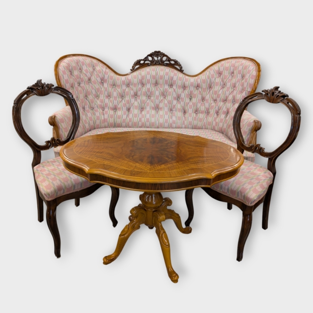 Soffa med 2 stolar i tulpanmönstrat tyg och ett bord, rokokostil