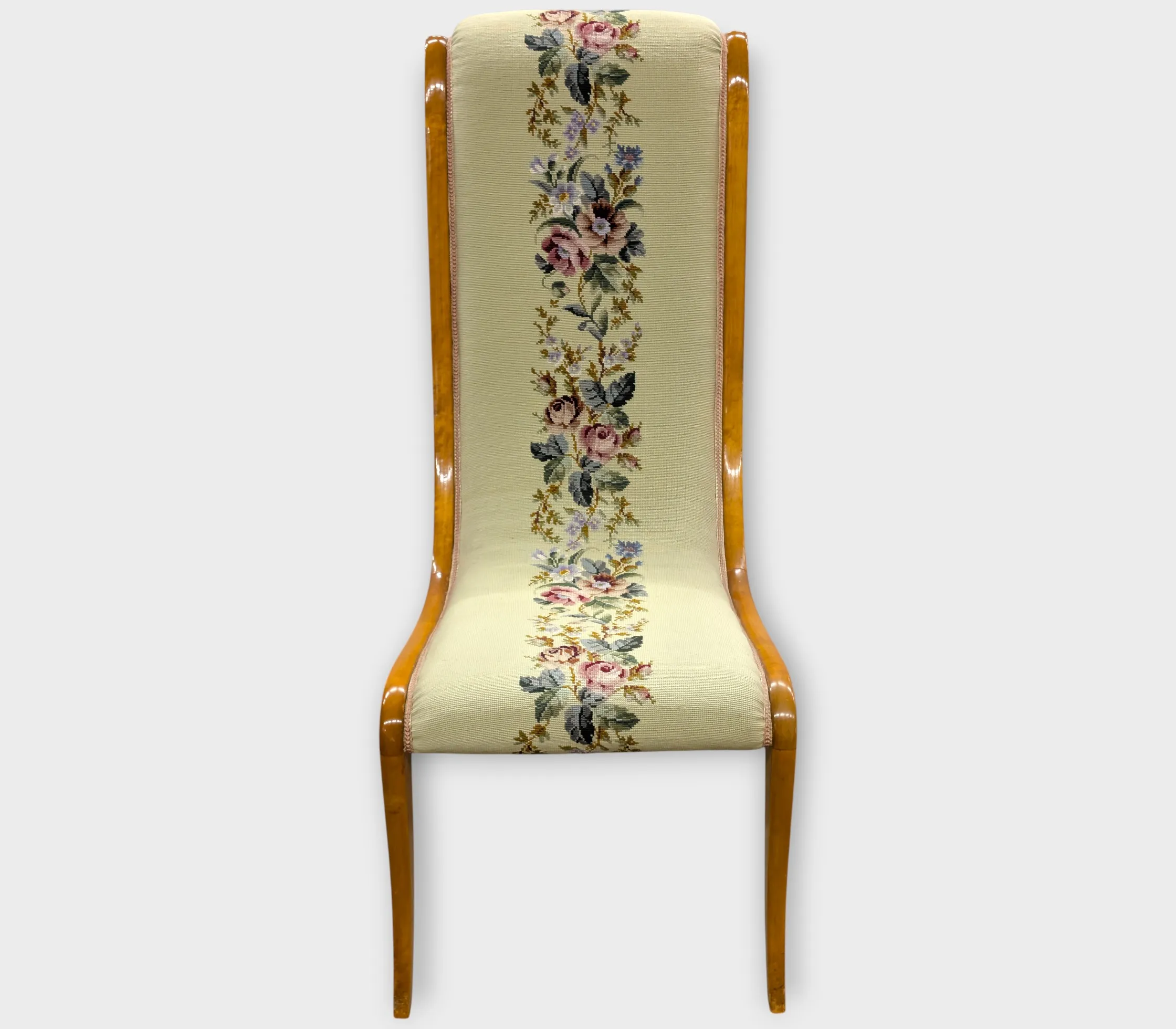 Svanhalsstol, broderad klädsel med blomotiv
