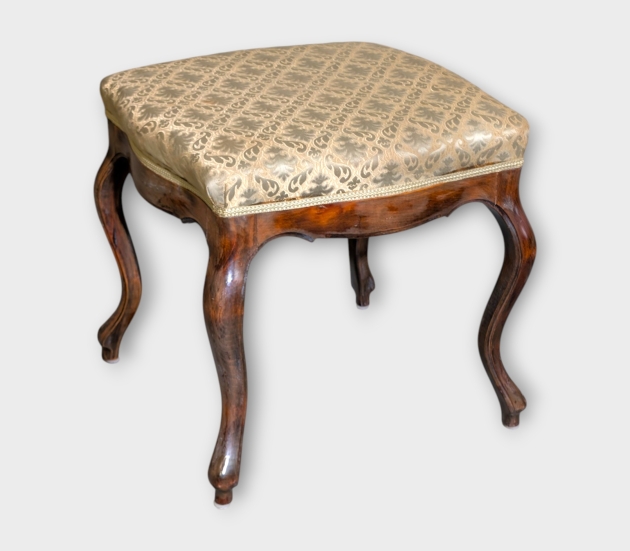 Taburett i rokoko-stil, klädd sits med mörk trästomme, bruksslitage