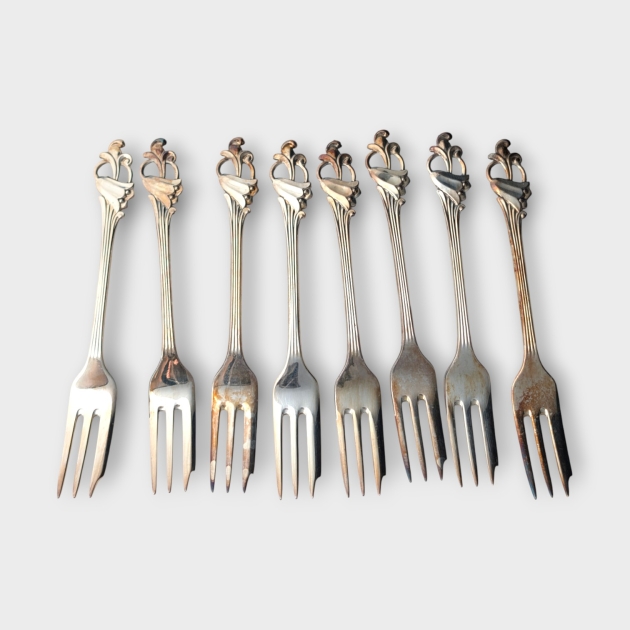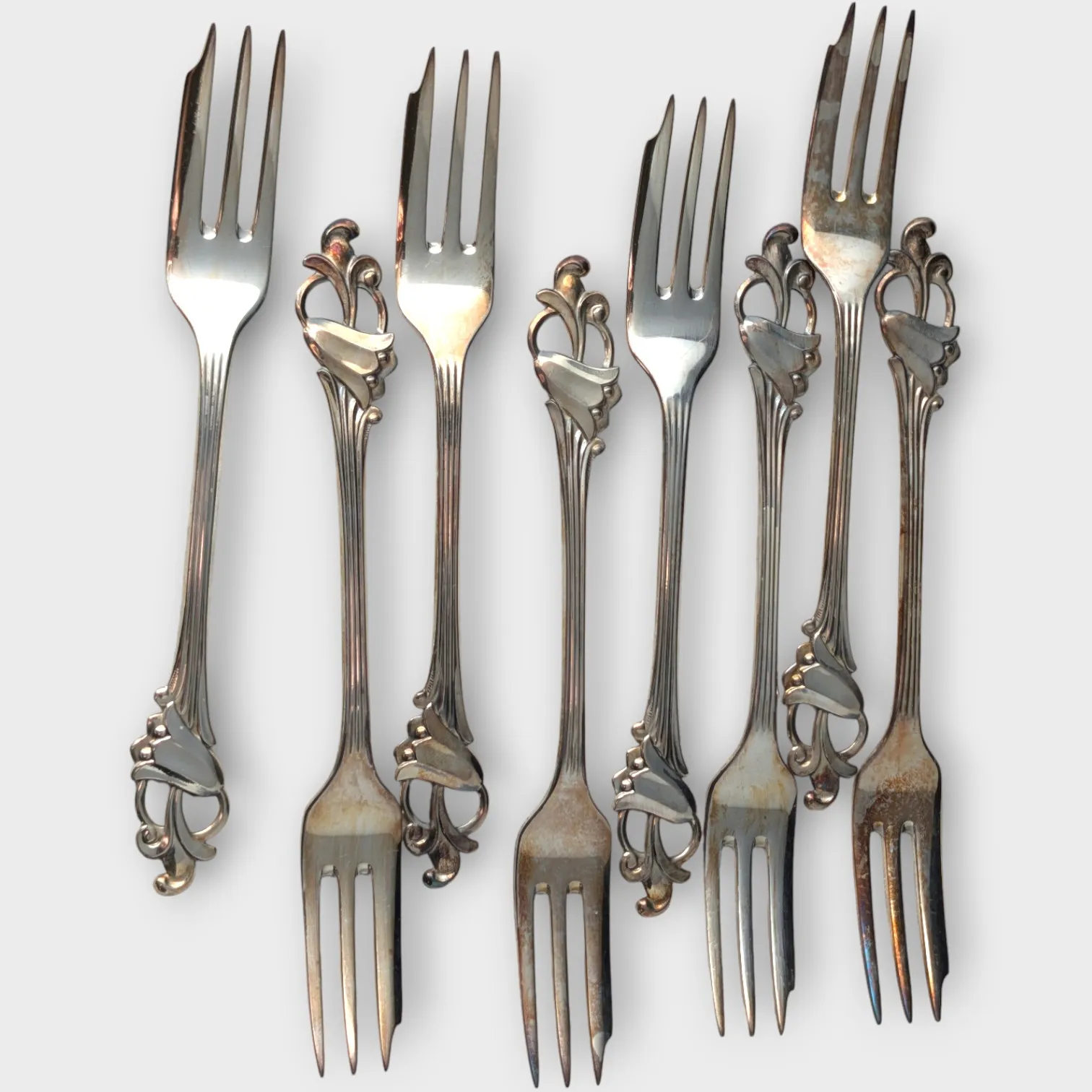 Bakelsegafflar, 8 st, silver, "Blåklocka", Thorvald Marthinsen Sølvvarefabrik, Norge.
