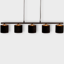 5 ljuskällor, svart med mässing, Höjd med skärmar och takupphäng 130 cm (sladdlängd ca 120 cm) Bredd 110 cm