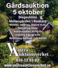 Auktionen startar 27/11 kl 19.00 Vunna objekt hämtas vecka 48 Tisdag - Torsdag 9.00-12.00 13.30-17.00 Fredag 9-12.00 Betalning sker på plats. Bankgiro betalning ta med kopia. Tänk på att ja[..]